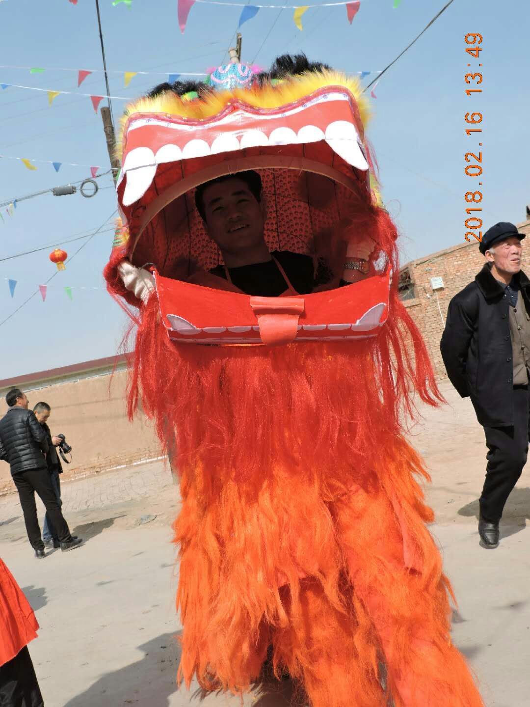 舞狮子的人过来了,舞狮子一共是五个人两个人舞狮子,一个人装扮武松,一个人打着鼓,另一个人敲着锣,武松手里拿着一个彩色的花球,来诱狮子,狮子盯着那个球跳来跳去,武松把那个球扔在地上,狮子就去咬那个球,怎么咬都咬不到嘴里,然后就围着那个球转圈,然后武松拿着那个球往前走,狮子也就跟着走了。