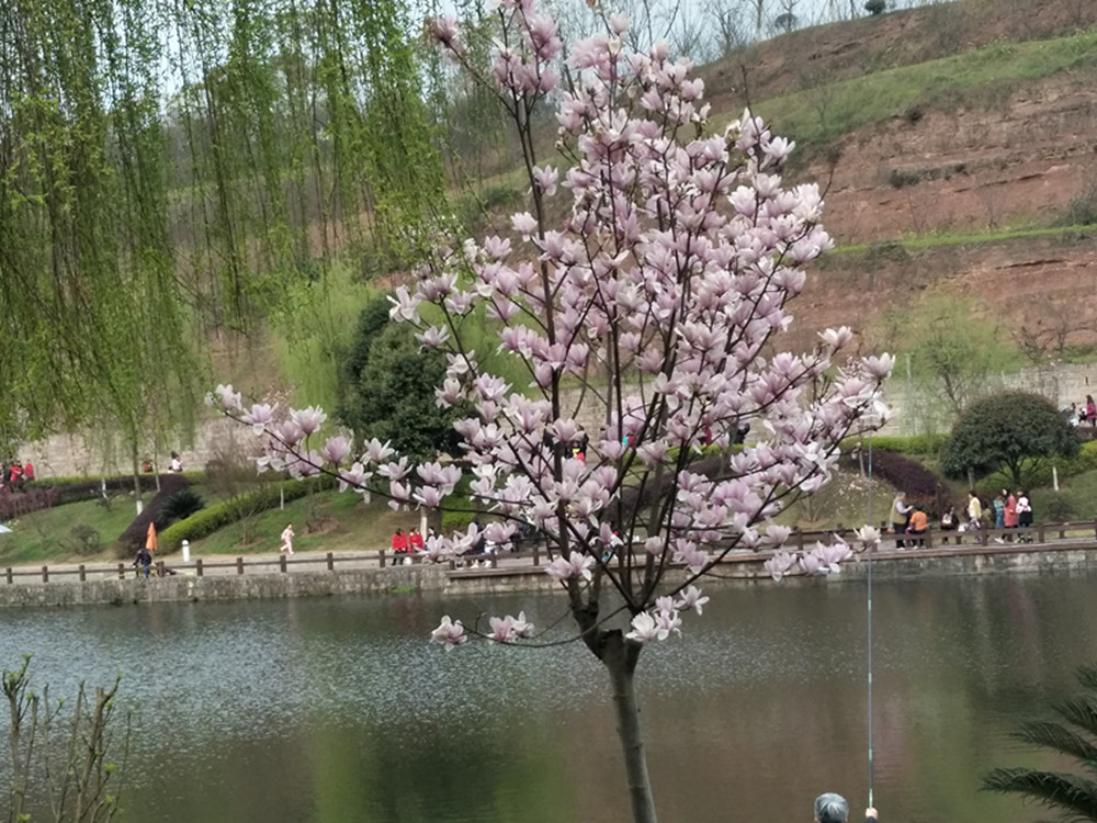 欣赏完桃花后我又来欣赏白玉兰。它全身粉白,在柳条的衬托下呈现出了美丽动人一道风景线,远看是一只只粉色的蝴蝶停在上面休息。想象一看还以为是一个仙女在那照镜子呢!