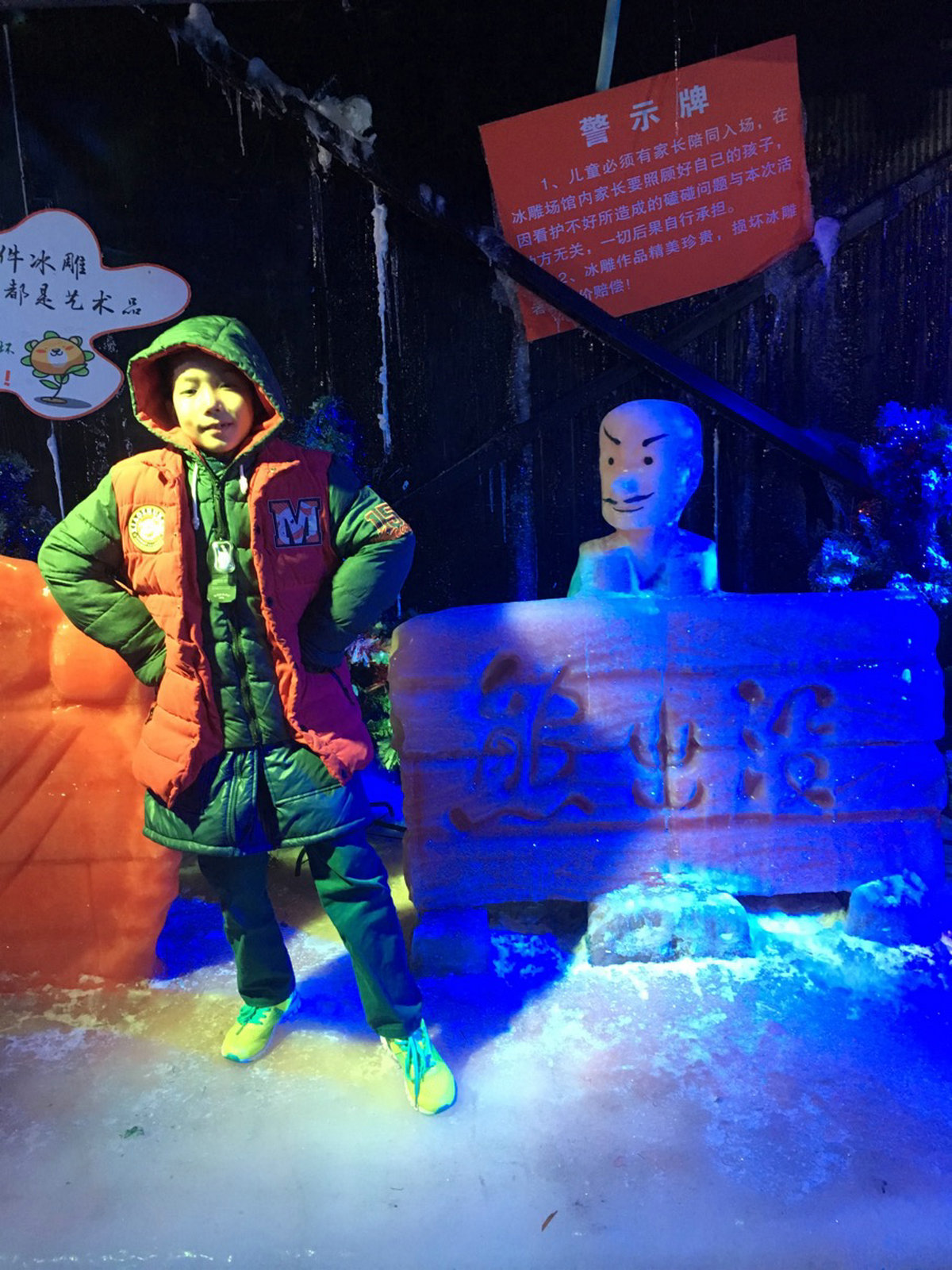 首先,映入我眼帘的是一座大型企鹅冰雕,之后发现地板都是冰做的,特别的精致。再往里面走,发现了许多冰雕,比如:天鹅、钢铁侠、变形金刚……继续向前走,发现了一座偌大的冰屋,之后玩了一个叫雪地寻宝的游戏,我找到了一个银盖子,换了五个电玩币,我非常的自豪!