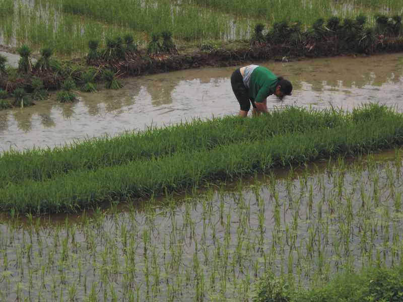 正午时竟淅淅沥沥的下起了小雨,河面上又起了一层薄薄的雨雾,人们穿着蓑衣,戴着斗笠,依旧走过木桥,去到河那边插秧,白鹭在小雨中盘旋后,停留在木桥旁边的河滩上,不远处几户人家升起了袅袅炊烟,这一切构成了一幅烟雨风景图让人如痴如醉。