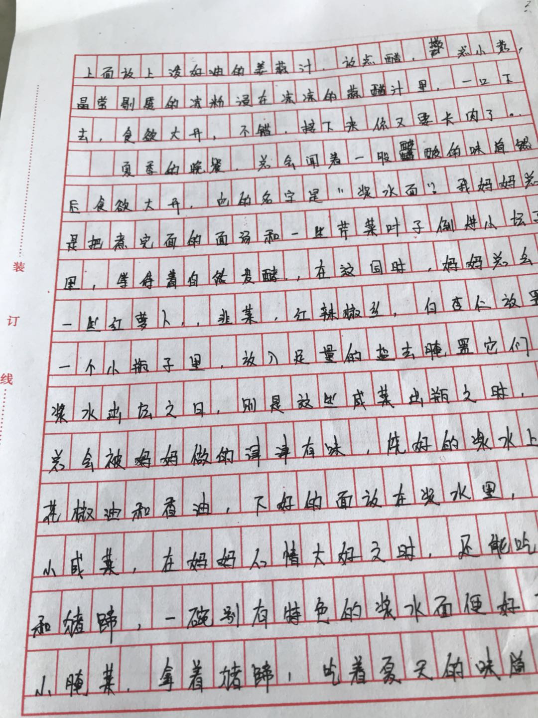 炎热的夏季总让人提不起食欲,唯一例外的是妈妈的浆水面。浆水是妈妈提前发酵好的。制作工艺简单,却每家的味道都不同,用开水烫些萝卜丝,莲花菜或者是芹菜,抑或是苦菜这样的野菜,加一碗刷了面粉的水放在浆水缸里,最后倒进去整坛的开水。夏天天气热,一天就会发酵成带清香的酸味浆水。这是我们甘肃人的解暑必备。妈妈还会用胡萝卜,韭菜,红辣椒丝,白杏仁加食盐腌制成咸菜。作为调浆水面的调味品。煮好了面条,自凉开水里过一下凉,浇上用葱花油炝好的浆水,放一些翠绿夹着鲜红、嫩白、橘黄小咸菜,一碗浆水面就成了。妈妈心情大好的时候,还会吃到升级版的浆水面:浆水面配卤肉和猪蹄。我自信这世上只有妈妈的浆水面是正宗。这也将是我日后乡愁的味道。
