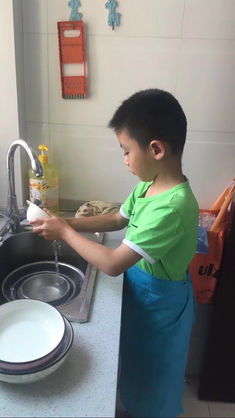 家长寄语:孩子吃饭慢,为了督促他快点吃饭,我们就说谁最后吃完饭,谁洗碗。孩子先把碗洗干净,再清水冲洗,碗从大到小的摞起来。洗完碗有把地拖干净,厨房的地虽小,拖得很认真,柜子的角落,门背后,角角落落都弄干净了。孩子干的很有条理,也很认真。值得表扬!