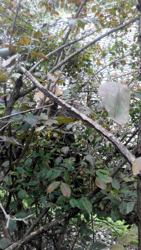 终于 ,两个小时的煎熬后,天气稍转暖和。站在地面上能摘的也已经摘完了,剩下的只能上树了。于是我把袋子中的都倒进了大口袋中,带着两个空袋子上树去了。树上的在地上看上去很多,可是一上去就摘不到了,因为人只能站在粗树枝上,而茱萸却长在枝头上,真不好摘,只能用钩子勾过来一只手捏住一只手摘,还要注意不要掉下树,树不上可站脚的地方,也不多,真不容易。