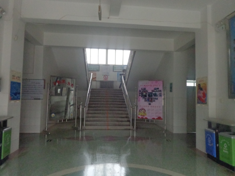 一进门,看到的是国旗和一块大石头,上面写的两个大字,善心,然后就是高高的国旗杆子,还有我们应以为傲的国旗,然后是我们的教学楼,有五层高,一楼是营养早餐室和图书馆,体育室,二楼是七八年级的教室和老师办公室,三楼是九年级教室,和化学实验室,四楼是多媒体教室和会议室,五楼是音乐教室,还有心理健康室。下了楼有一个大大的操场,上面有四颗柳树,老师说这棵树是创建学校的时候种的,下面是停车场,还有教工食堂,老师说那是以前的教室,我们都不相信,但那确实是以前的教室。