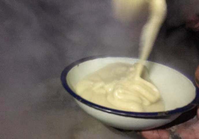 首先,把土豆清洗干净,去皮,放在锅里煮至半熟,然后捞出来沥水,把土豆放入碓{dui}窝(一种石制的器皿中)捣碎,做成土豆泥。之后把半熟的土豆泥放入加水的大锅中煮熟,煮熟后,在锅中加入玉米面粉,边加面粉边搅拌,等到面的表层变得光滑以后,再加入一些开水,把火烧的旺旺的,继续用专门的工具搅拌,顺着一定的方向搅拌,等它成为黏糊糊的时候,土豆泥已经和玉米面粉彻底的合二为一了,这个时候,搅团就做好了。