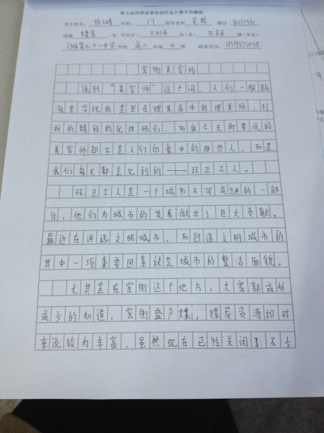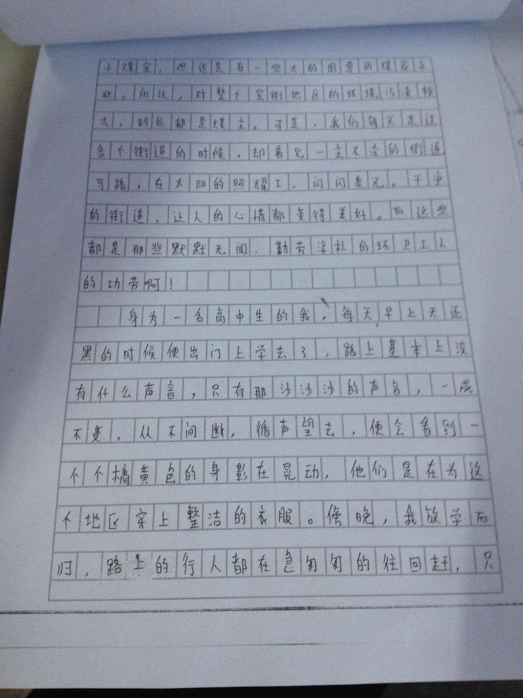 身为一名高中生的我,每天早上天还黑的时候便出门上学去了,路上基本上没有什么声音,只有那沙沙沙的声音,一成不变,从不间断,循声望去,便会看到一个个橘黄色的身影在晃动,他们是在为这个地区穿上整洁的衣服。傍晚,我放学而归,路上的行人都在急匆匆的往回赶,只有那些身影依旧在低头打扫每一个凌乱、肮脏的角落,那些地方,很多人避而不及,只有他们不怕脏,忍着臭味,勇往直前,他们是这个城市的勇士。