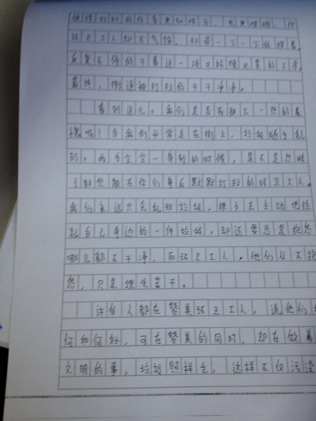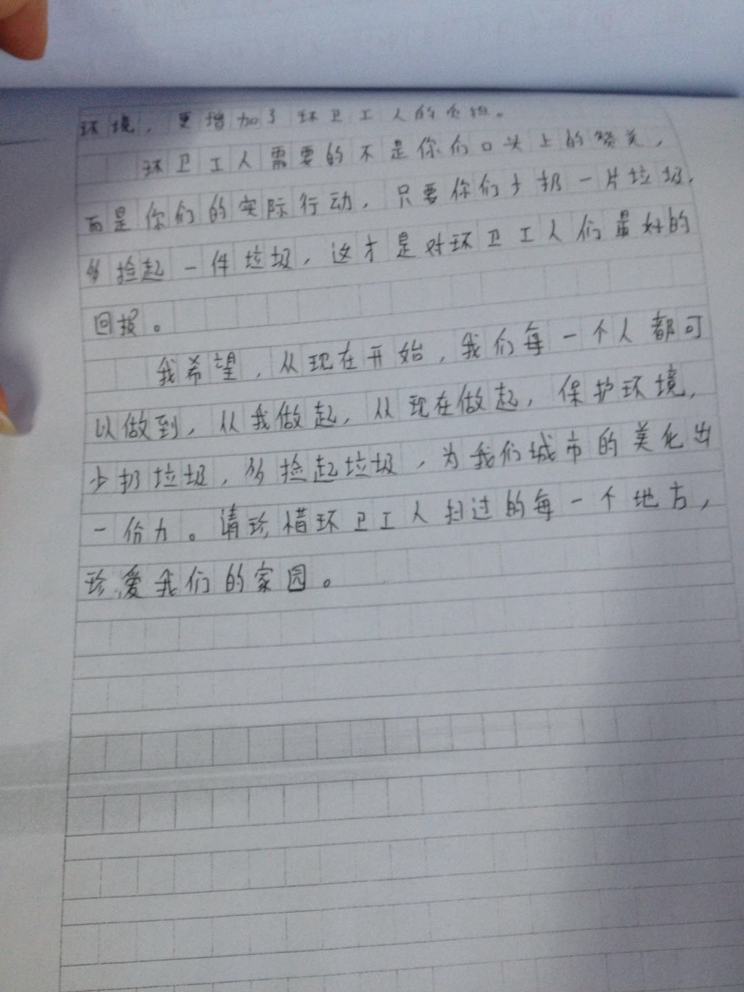 我希望,从现在开始,我们每一个人都可以做到,从我做起,从现在做起,保护环境,少扔垃圾,多捡垃圾,为我们城市的美化出一份力。请珍惜环卫工人扫过的每一个地方,珍爱我们的家园。