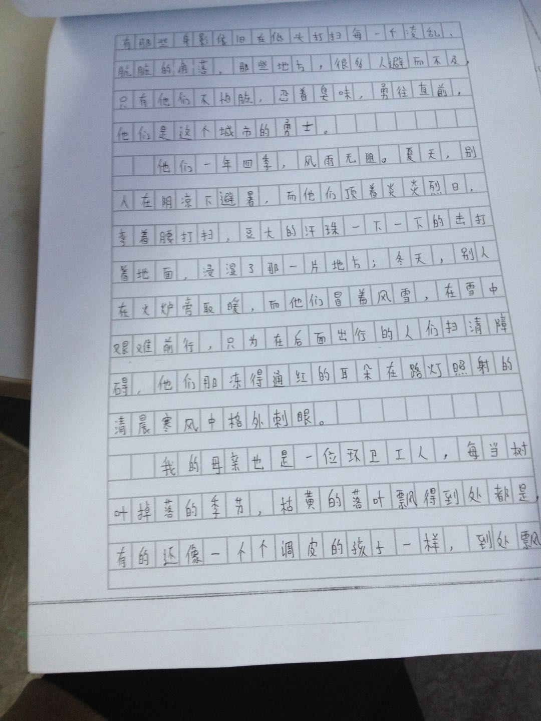 我的母亲也是一位环卫工人,每当树叶掉落的季节,枯黄的落叶飘得到处都是,有的还像一个个调皮的孩子一样,到处飘,使得打扫的任务更加艰巨,也更艰难,但环卫工人却不气馁,扫帚一下一下的挥着,反复不停的干着这一项又枯燥又累的工序,最终,街道被打扫的干干净净。
