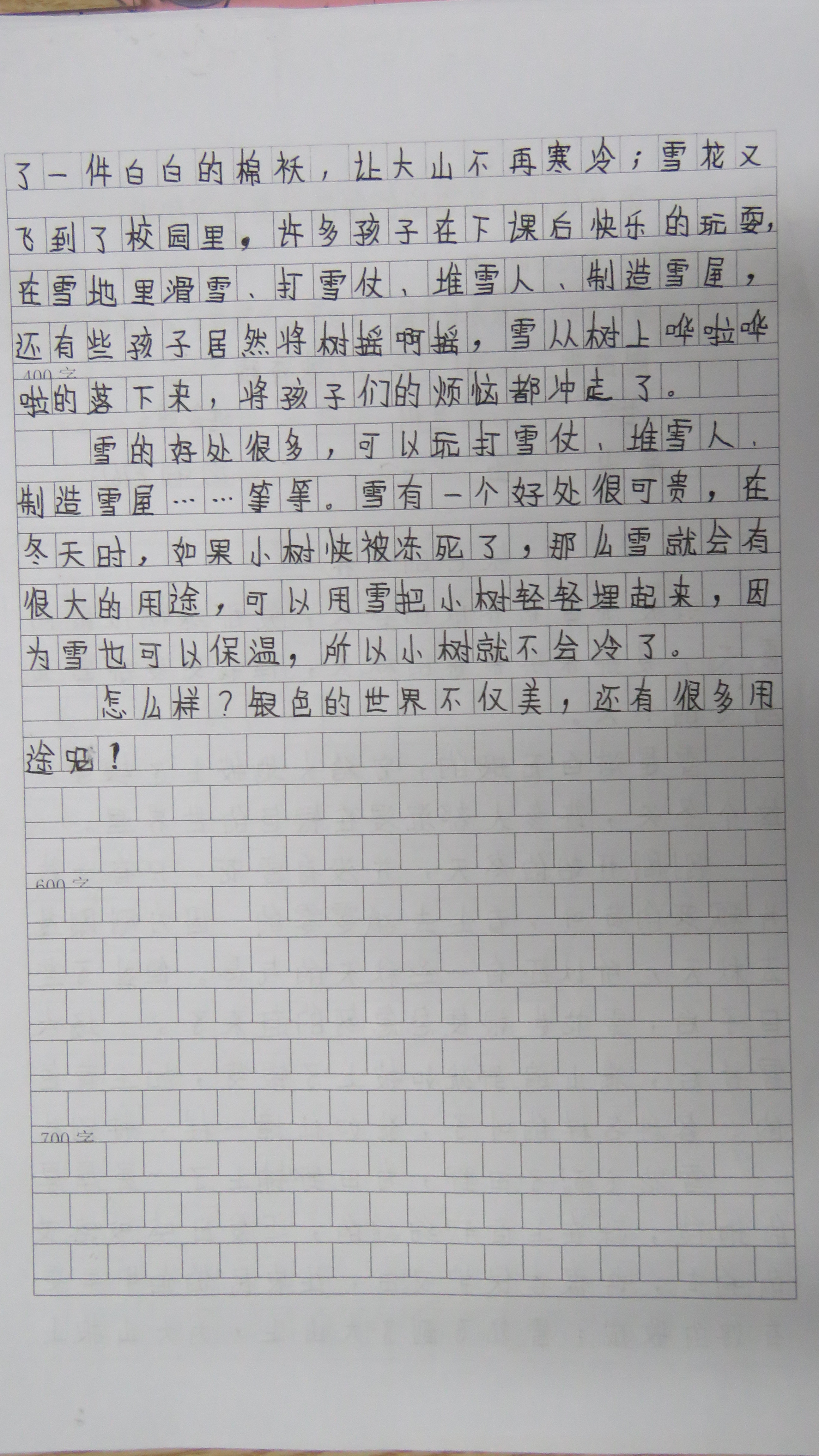 雪花飞到了田野,为田野铺上了一层厚厚的地毯,踩在上面软绵绵的,还发出咯吱咯吱的响声,好像在保护好农田,让农民伯伯明年更又好的收成;雪花飞到了大山上,为大山披了一件白白的棉袄,让大山不再寒冷;雪花又飞到了校园里,许多孩子在下课后快了地玩耍,在雪地里滑雪、打雪仗、堆雪人、制造雪屋,还有些孩子居然将树摇啊摇,雪从树上哗啦哗啦的落下来,将孩子们的烦恼都冲走了。