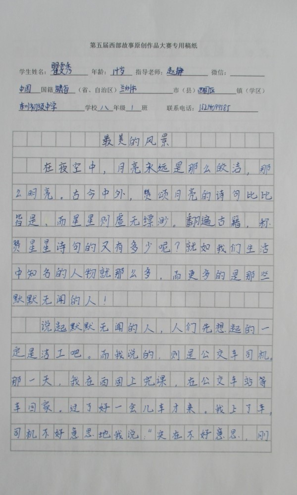 说起默默无闻的人,人们先想起的一定是清洁工吧。而我说的,则是公交车司机。那一天,我在西固上完课,在公交车站等车回家。过了好一会儿车才来。我上了车,司机不好意思地对我说:“实在不好意思,刚刚堵车了。”我没说什么,心里却是满满的抱怨:唉,车怎么才来?天都快黑了!我正要找钱付车费,却发现兜里的两块钱不翼而飞。我慌了,心里想:我记得装了呀,怎么会没有?司机看出我的慌张,问道:“是不是忘带钱了?"我红着脸,低下头,点了点头,想着肯定会挨一顿骂,又想着今天为什么这么倒霉。司机笑了笑说:“没关系,上车吧。我看你肯定赶时间,快上来,耽误了时间就不好啦。”我喜出望外,激动地对司机说:“谢谢叔叔。”看着司机叔叔开车的背影,想着:这一定是全世界最美的风景吧!