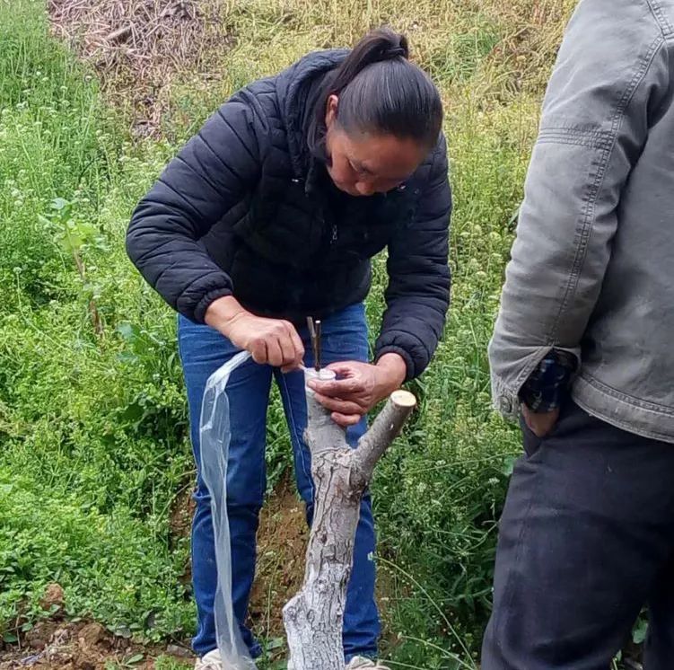 “看,有人在嫁接梨枝了!”一句话让我停下脚步,想看看那同样的梨树是怎样长出不同形状、不同口味的梨儿来的,一男一女,皆中年人站在梨园中。女人蹲在一株小小的梨树旁。男人弯腰,站于其旁,这棵小梨树,只有光秃秃的枝干,但树干顶端的两边竟有两节短短的小梨枝。女人用细长的薄膜固定在树干上,像小蛇,长着两个犄角。男人在旁说道,“我来,我来!”女人阻止了他,用灵巧的手,温柔的为树枝缠着薄膜,他们的身旁有两株嫁接好的小梨树,静静地站着,微风吹来,一半两半梨花从枝头飞落,落在女人和男人的肩上。