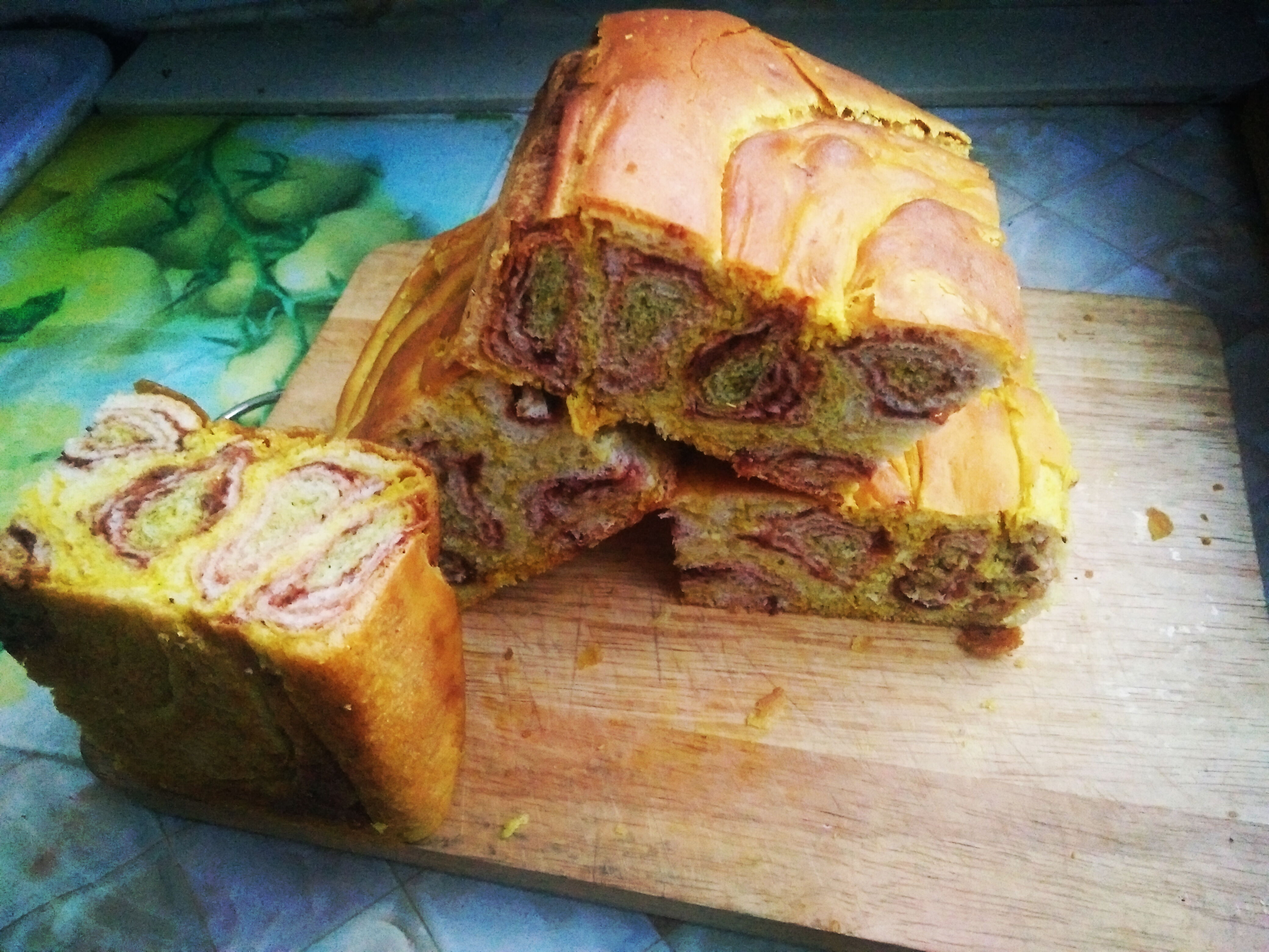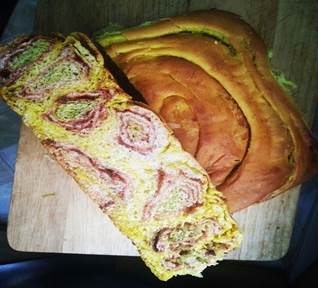 在我的家乡永登有这样一道面点,它外酥里嫩,香软可口,外形呈长方体,别看它的外表单一而普通,它的内在可丰富得很,它是由多种原料搭配而成的。当你用刀轻轻的切开它时,你就会看到如七彩丹霞一般的“风景”。说到这里,你一定很想知道它是什么了吧,它就是我们永登独有的面点——“丁娃烧饼”。