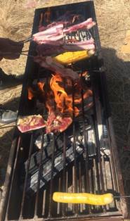 嗯,一闻这香喷喷的入味便知道是大伯叔叔们在烤肉了。凑近一看果然如此,只见大伯一手拿着一大串羊肉,另一只手拿着带油的刷子,跃跃欲试想在肉上再刷一层油,这样烤出的肉不会烤糊还会更加的美味。我们几个小馋嘴猫变按捺不住了,闻着香味连口水都快要流出来了。