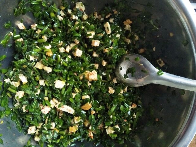 我进到厨房里一看,妈妈才在剥韭菜,便放下书包去与妈妈一同做了,韭菜不是很多,不一会儿,就剥好了,洗完就先放到一边晾着,同时我妈让我把面粉弄到盆里,我弄好后,拿到面前瞅一瞅,没想到,我就呼吸了一下,那面粉就扑起来了好多,让我白白挨了一顿骂,我妈从我手中接过面盆,让我按住盆,她一手拿着筷子攥成一把,一手提着刚烧开的滚烫的茶壶,向面粉里面边倒水边快速的搅拌,我按着盆子的手,躲躲闪闪的,生怕开水溅到自己,当水倒到,面可以和在一起后,就倒到案板上了,和成圆圆的长棒,用塑料裹上,紧接着,我妈说和点豆腐拌上,就把一小块儿豆腐切成片,在电饼铛里倒上油,油过了,就把豆腐片放进去,我一看,我说:"妈,这油也太多了吧,都漫过豆腐了,"你知道啥?这豆腐又不吸油,炸完豆腐,我等会儿煎韭菜盒子不就行了吗?"哦!"盖上盖,我听着那滋滋的油声都有些兴奋,两分钟后,豆腐一面炸至金黄,我爸就翻了个面,刚刚全部翻好,我妈便让我爸把豆腐捞出来,我急忙说:"别、别、别啊!这不是要炸至两面金黄吗?这才刚翻过来啊!"我爸还没说话,我妈便张嘴了,说:"这油炸一下豆腐除了香一些外,更主要是为了使豆腐柔一些,后面切成小丁和到韭菜里时搅拌不易碎,捞出来的豆腐先放到一边晾着,我妈向韭菜盆里淋上清油,搅拌,再把豆腐切成小丁,放到韭菜盒里搅拌均匀,然后放上花椒面、红辣面,我妈说:"要特别注意,盐一定要最后放,因为提前放盐的话,会弄干韭菜中的水分,所以盐要最后放,"搅拌后,馅就好了。我妈把面上的塑料一揭,切下来一片一片的,不能太薄,要有些厚度,然后用擀面杖擀成圆形,在除去要压的边外,剩下的一半地方放上馅,把另一半拿起来盖上,做成一个弧形就好了,边一定要捏好,不然馅会漏出来,这样一来,基本上就好了,只剩下最后一道工序了,那就是煎。