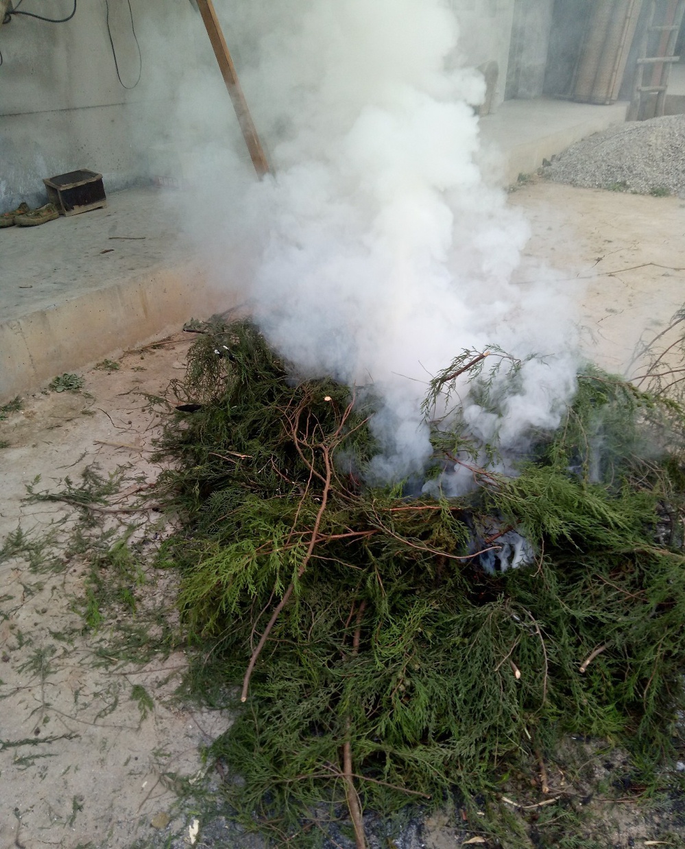 腊肉是用五花肉做的,盐涂满五花肉全身就可以了,这个比较简单。腌制几天和香肠一起拿去烟熏。烟熏的材料是木料的锯木粉和松柏枝叶。选一个天气晴好的日子,搭一个简易棚子,炉子上放香肠和腊肉,下面烧火,火上浇木料的锯木粉,熏得黑黑亮亮的香肠和腊肉是最漂亮的成果。