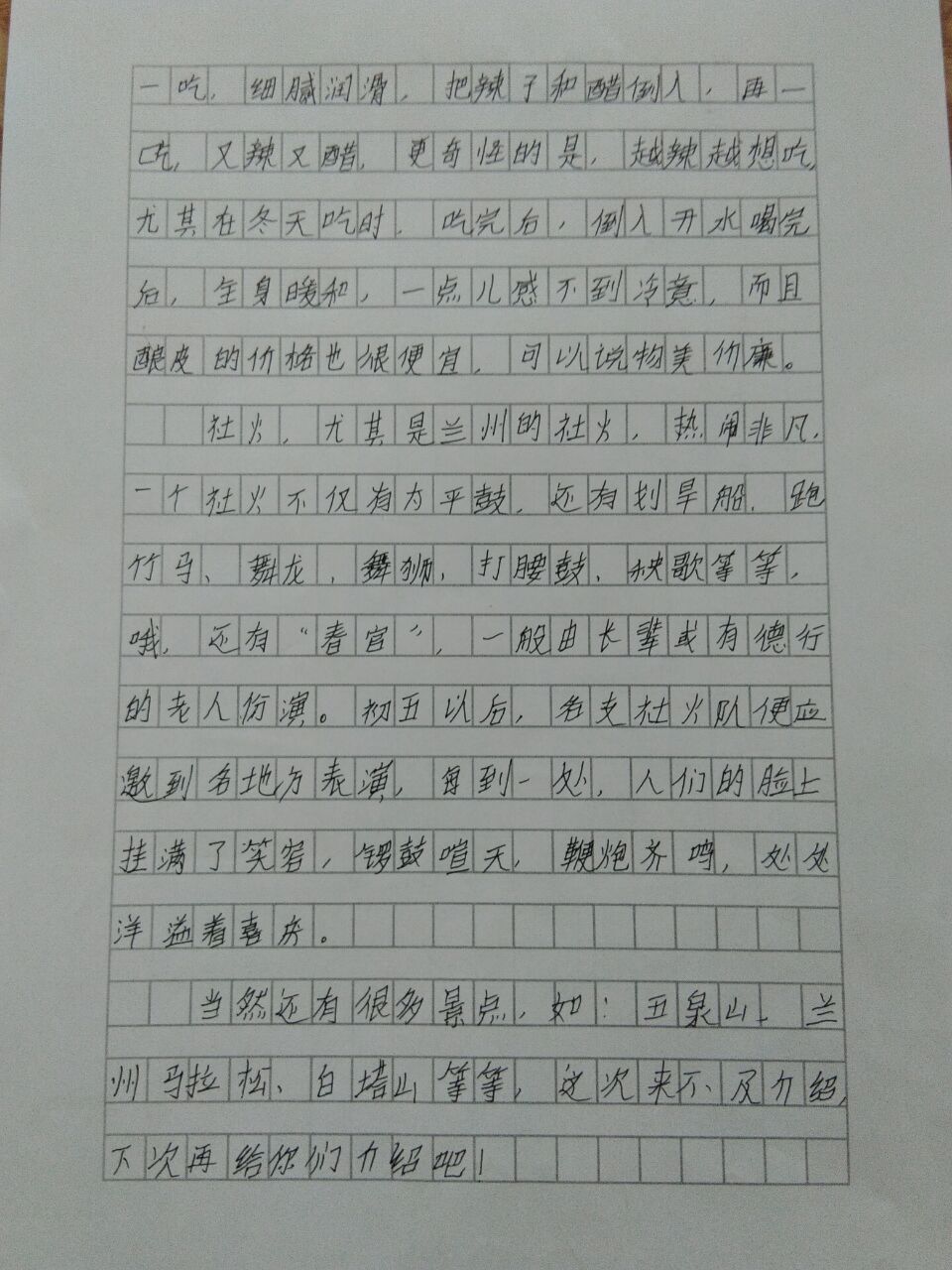 来到兰州你想吃酿皮的话,就去金崖,你到了后如果想打听酿皮的话,是听不到酿皮的,而是"rang皮子",这是兰州人的叫法。酿皮端上来后,一看,色泽鲜亮,一吃,细腻润滑,放入辣子和醋,再一吃,又辣又酸,更奇怪的是,越辣越想吃。尤其是在冬天吃,吃完后把汤倒入开水喝了,全身热乎乎的,一点也感不到冷意,而且酿皮的价格也便宜,可以说物美价廉。社火,尤其是兰州的社火,热闹非凡。一个社火不仅有太平鼓,还有划旱船、跑竹马、舞龙、舞狮、秧歌等等。哦,还有"春官 "一半由长辈或德行的老人扮演。初五以后,各支社火队便应邀到各地表演,每到一处,人们脸上挂满了笑容,锣鼓喧天,鞭炮齐鸣,处处洋溢着喜庆。当然还有很多景点,如:五泉山、兰州马拉松、白塔山等等。这次来不及介绍,下次再给你们介绍吧!