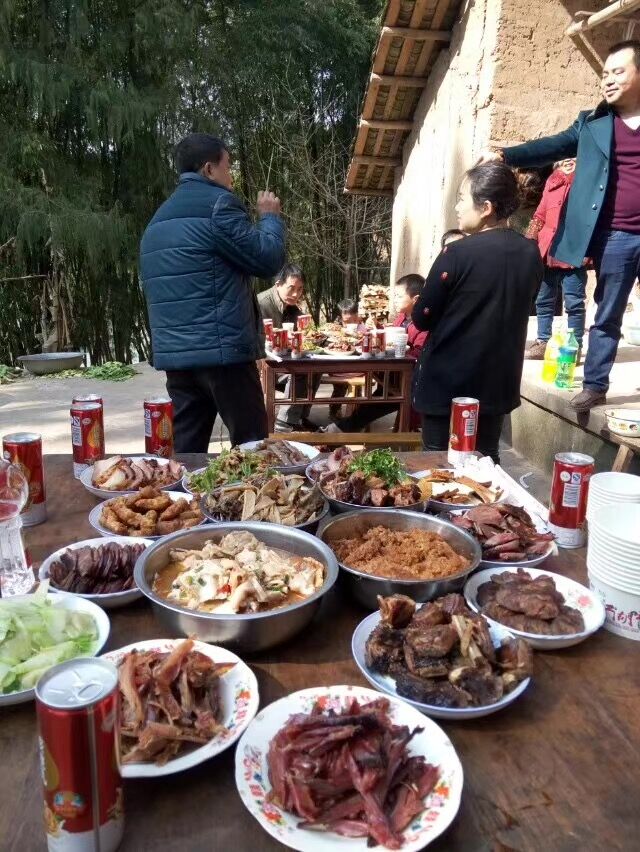 除夕那天,小孩子们欢喜,大人们却很忙乱。这天,家家赶做年饭,到处都弥漫着饭菜的香气。经过几个妈妈(几家人在一起过年)在厨房的一阵忙活,很快,丰盛的佳肴便端上了桌。由爸爸们张罗燃放完表示要吃午饭的鞭炮信号后,我们要开始谢天地,祭畜神、灶神。举行完这些重要的仪式,还要“请”祖宗们先“用餐”。接下来,把爷爷奶奶搀扶到上席就坐,我们也就围坐桌边,开始大快朵颐,这时候,孩子们的欢笑声,大人们的祝酒声,响彻了这个僻静的的山村。