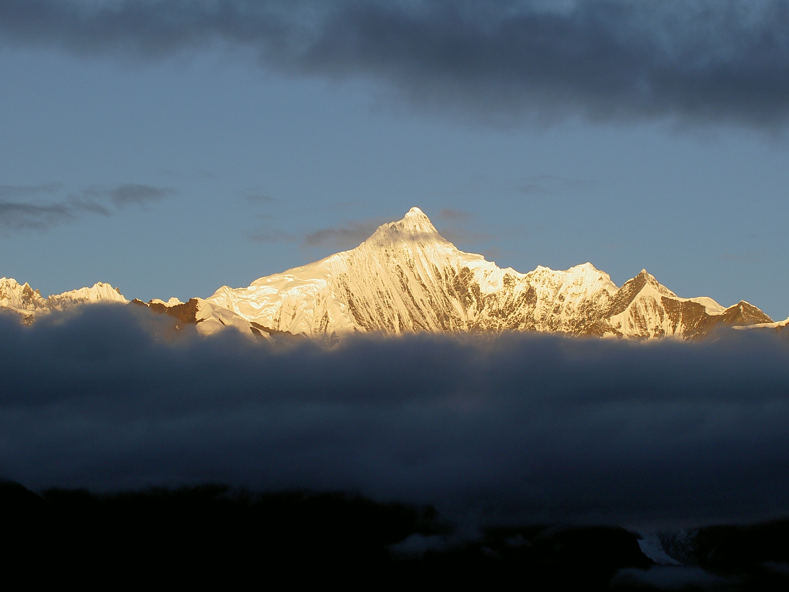 日出。到梅里雪山的时候,已是晚上,旅舍对面什么都看不到,半夜起来的时候,突然看见半空中悬着一座山,吓了一跳。凌晨,太阳慢慢升起,山峰瞬间被镀上金光,神圣无比。