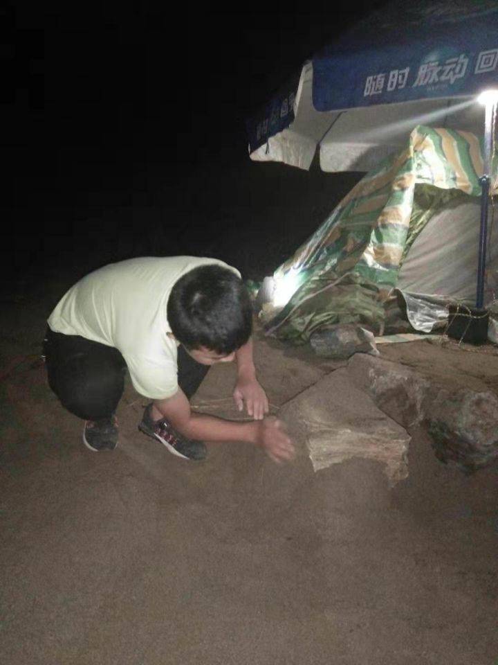 鱼竿打好后,该去搭帐篷了。先将支架架好,再把帐篷表皮盖好,帐篷就差不多好了。不过为了防止雨水进入,我们还在帐篷的外围铺了一层彩条布来防水防潮。这时已是傍晚,天马上就要黑了。