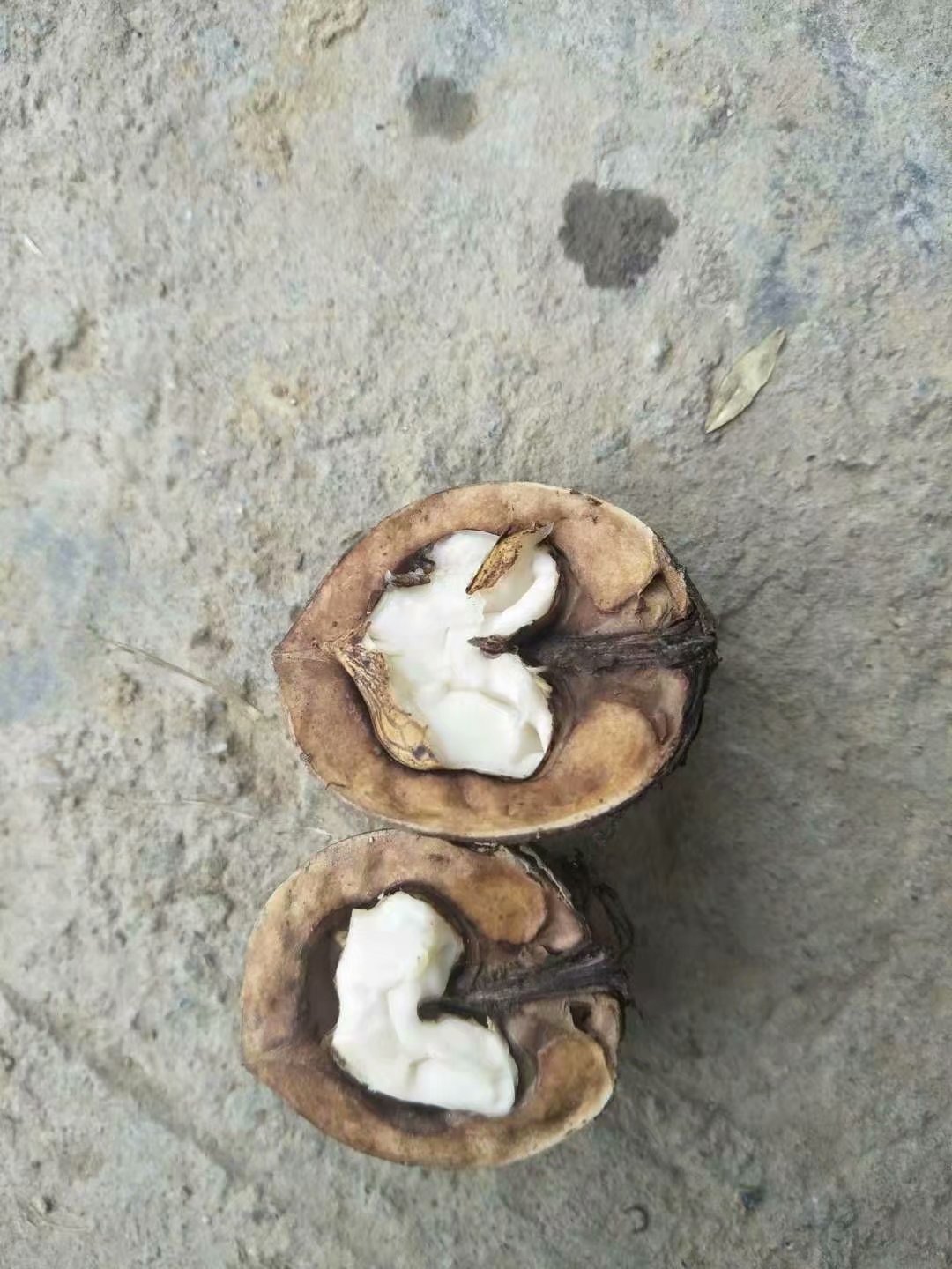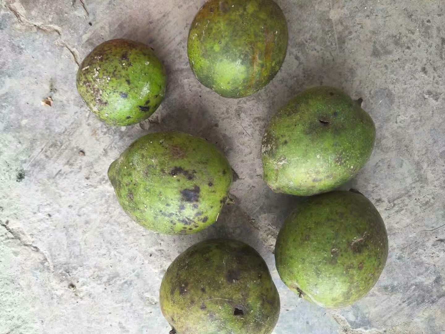 夏末,树上冒出一颗颗果子。核桃刚结果时,就像葡萄一样圆圆的。一串一串的长在枝干上,表面看起来是绿的。核桃越长越大,到了秋天核桃成熟了,丰收的时候,人们就忙着找个长长的竹子和筐子,用竹子把核桃打落下来,一颗一颗的又捡到筐子里去,绿油油的表皮上有很多斑点。把表面上那层绿袍剥下来,呈现在面前的是一道道不平的道路。想吃到里面的果肉,那就必须有耐心,所谓"心急吃不上热豆腐"。接着用石头把里面的那个壳砸开,里面的果肉才能显现出来。