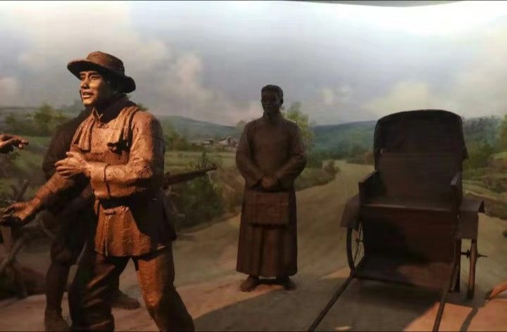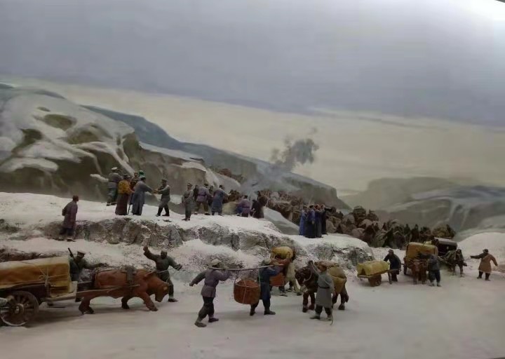 顺着参观路线再往里面走,就可以看到一个很大的模拟场景:一片茫茫雪山的背景,战争一触即发,前线物资缺乏,后方群众冒着严寒,有的牵着牲畜用马车拉;有的拉着人力车送;还有的直接用肩膀扛着送。战士们纷纷跑过来迎接,他们紧握住群众的手,眼里满是感激,仿佛在说:"相信我们,这次一定打个大胜仗,让乡亲们过上好日子!"这场景不正印证了那句"军民鱼水一家亲"吗?让人备受鼓舞。