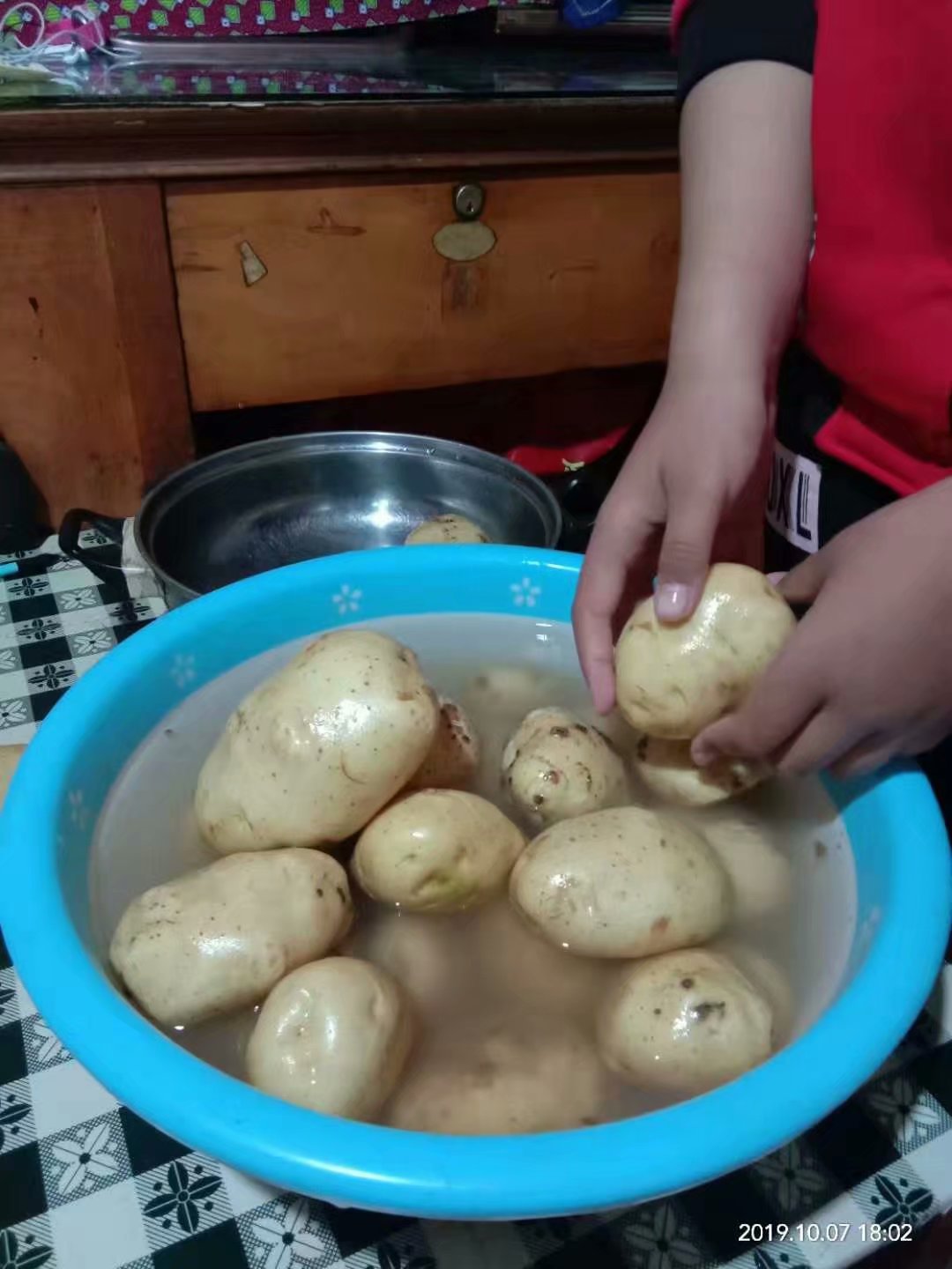洗土豆。先将准备好的土豆洗一遍,挑出里面不合适水煮的土豆,将适合水煮的土豆去疤,再洗一遍,直到干净为止。