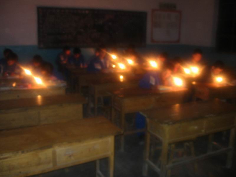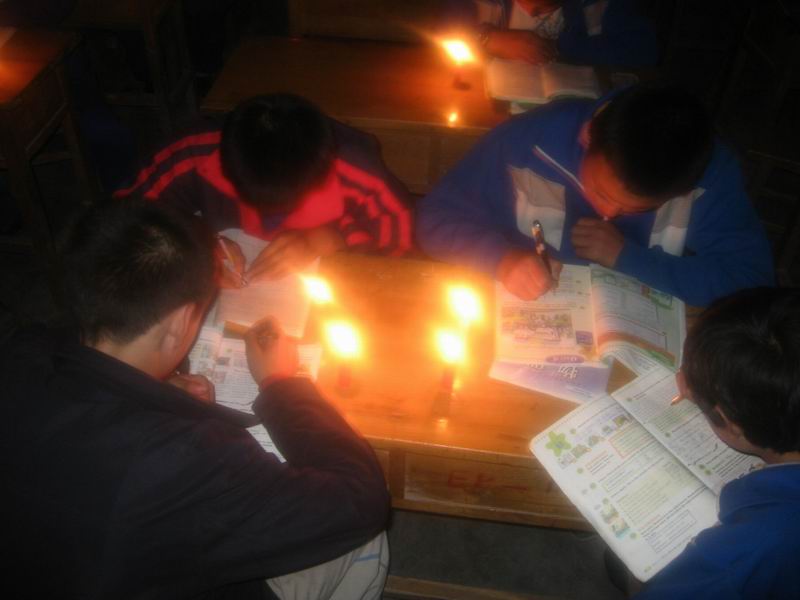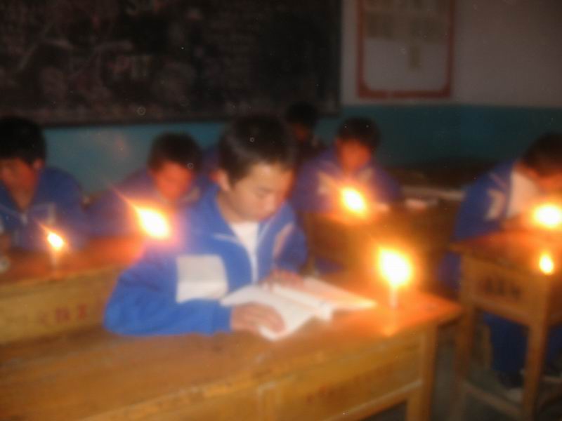 每当停电时,同学们拿出一支支蜡 烛,点燃后固定在桌子上,他们就继续上晚自习。一点点火红的烛光中,就好像是一双双渴望求得真理的眼睛,他们闪烁着,他们追求者。