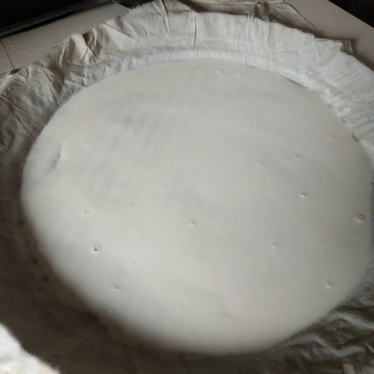 在铺好的白布上倒入面浆上锅蒸
