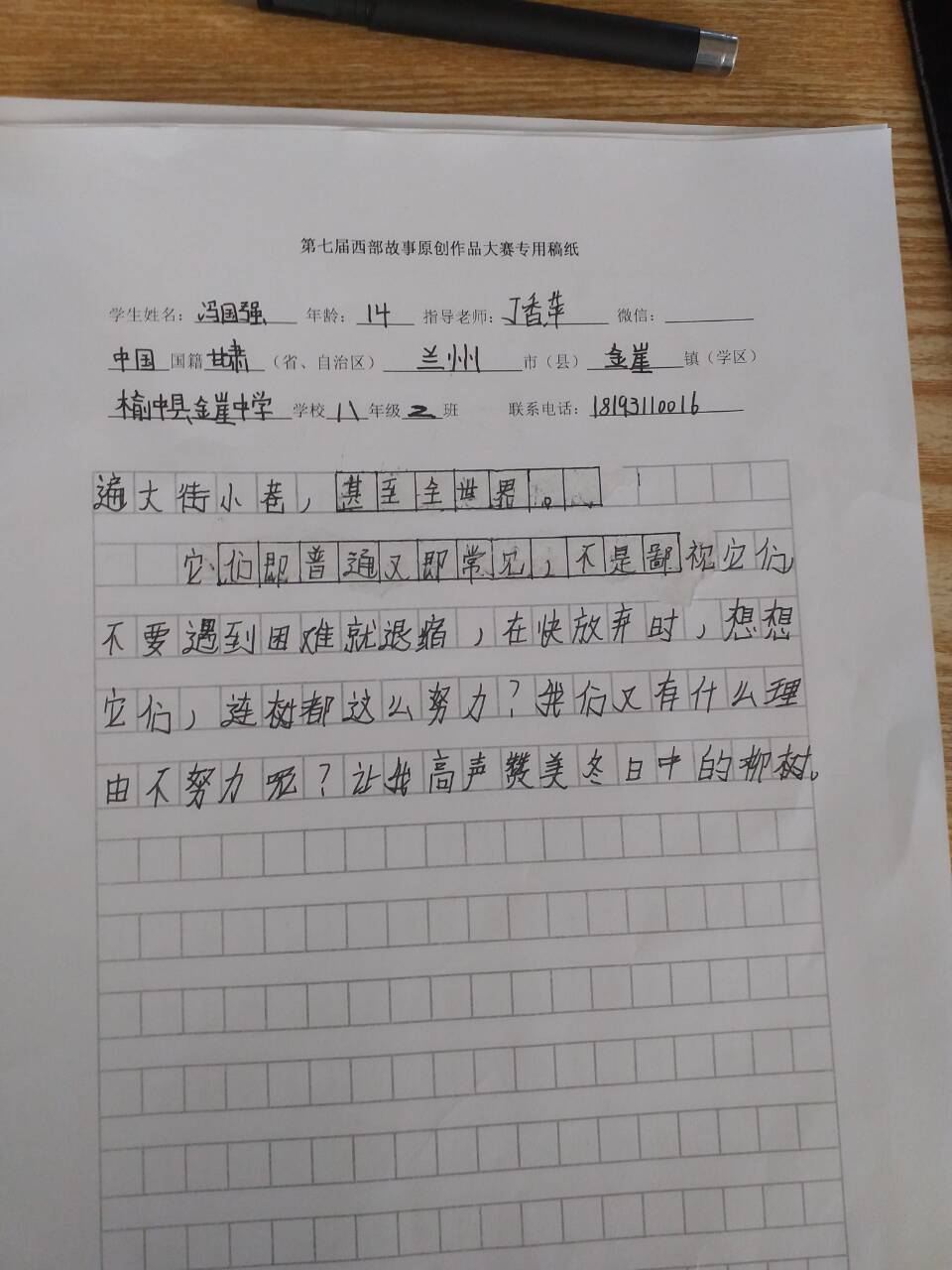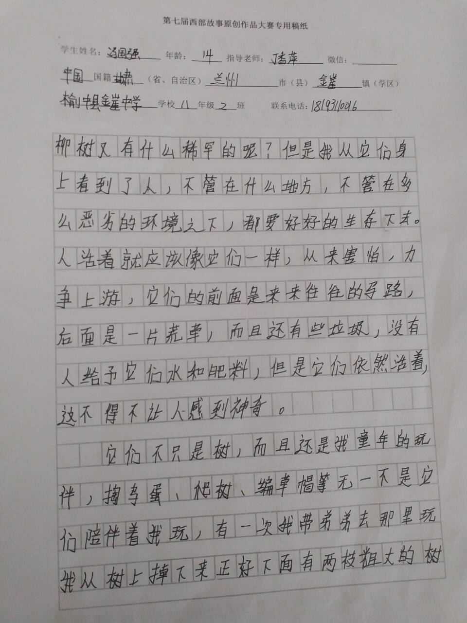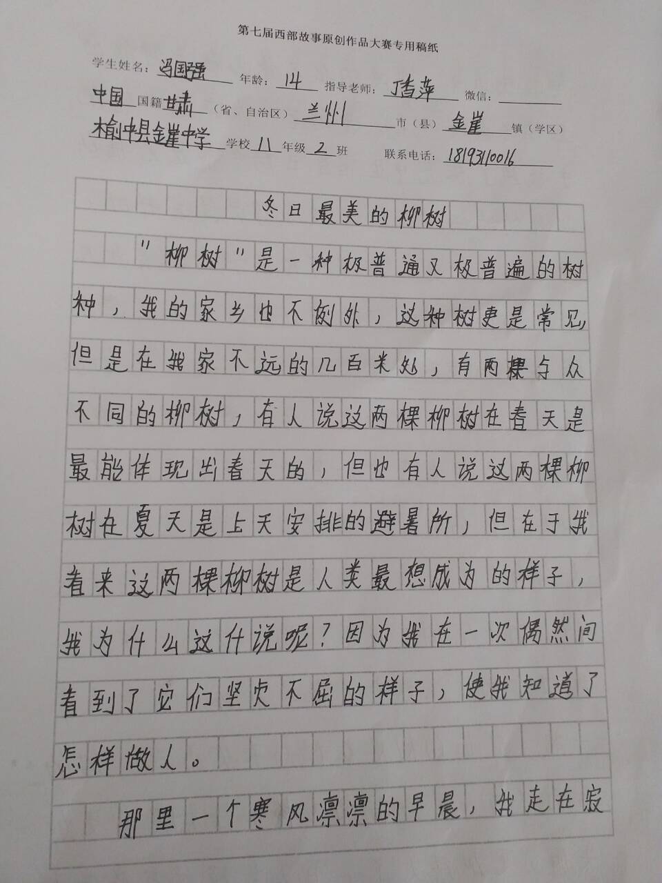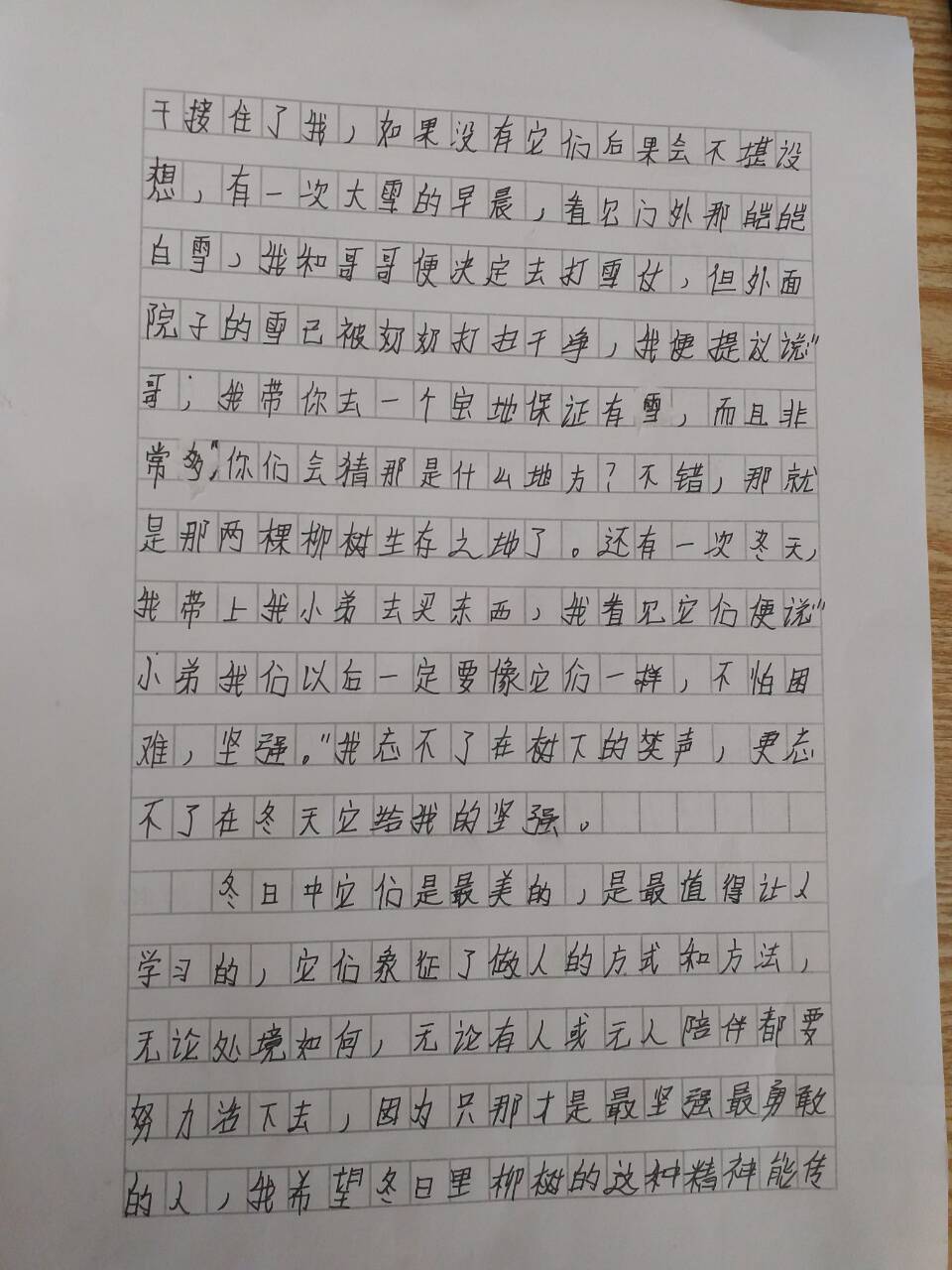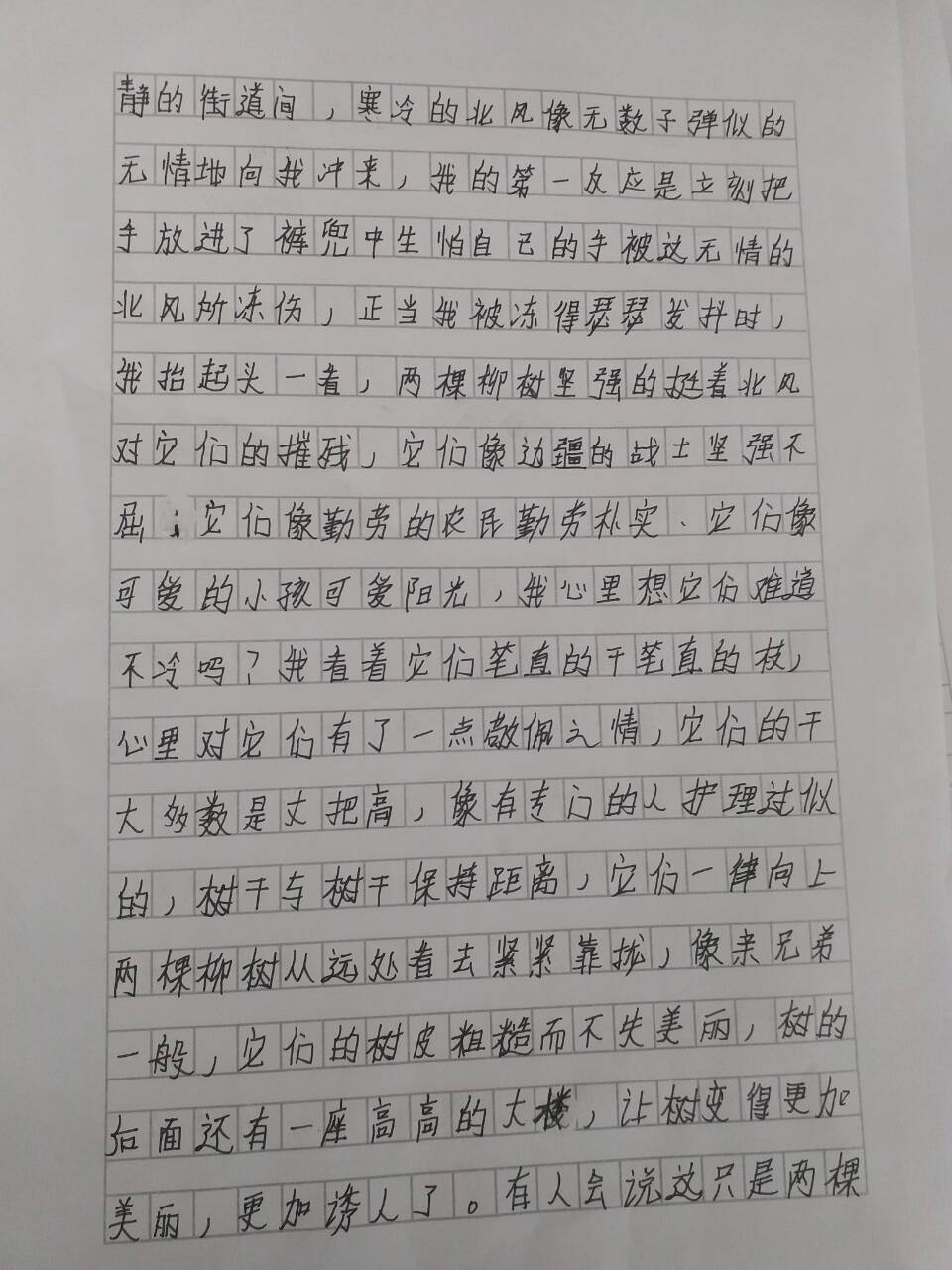 那是在一个寒风凛凛的早晨,我走在寂静的街道间。寒冷的北风像无数子弹似的无情地向我冲来,我的第一反应是立刻把手放进了裤兜中生怕自己的手被这无情的北风所冻伤,正当我被冻得瑟瑟发抖时,我抬起头一看,两棵柳树坚强的挺着北风对他们的摧残,它们像边疆的战士坚强不屈,它们像勤劳的农民勤劳朴实,它们像可爱的小孩可爱阳光。我看着他们笔直的干笔直的枝,心里对它们有了一点敬佩之情,它们的干大多数是丈把高,像有专门的人护理,树干与树干保持距离,它们一律向上。两棵柳树从远处看去紧紧靠拢,像亲兄弟一般,他们的树皮粗糙而又不失美丽,树的后面还有一座高高的大楼,让树变得更加美丽,更加诱人了。有人会说这只是两棵柳树又有什么稀罕的呢?但是我从它们身上看到了人,不管在什么地方,不管在多么恶劣的环境之下,都要好好的生存下去。人活着就应该像他们一样,从来不害怕力争上游,它们的前面是来来往往的马路,后面是一片荒草,而且还有些垃圾,没有人给予他们水和肥料,但是它们依然活着,这不得不让人感到神奇。