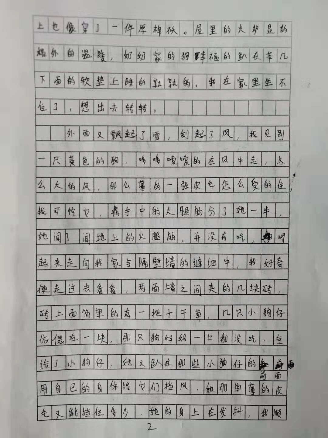 外面又飘起了雪,刮起了风,我见到一只黄狗,哆哆嗦嗦的在风中走,这么大的风,那么薄的一张皮毛怎么受的住,我可怜它,将手中的火腿肠分了它一半,它闻了闻地上的火腿肠,并没有吃,叼起来走向我家与隔壁墙的缝隙中,我便好奇的过去看了看,两墙之间夹的几块砖,砖上面简单的有一把子干草,几只小狗仔依偎在一起,那只狗妈妈却一口也没有吃,全给了自己的孩子,它又趴在那些小狗仔的前面用自己的身体给它们挡风,她那单薄的皮毛又能挡住多少,他的身上在发抖,我瞬间被感动了我从家里拿些吃完的骨头给了它们,又找了两件小时候的棉衣。可能这就是母爱吧,并不比人类的母爱缺什么。