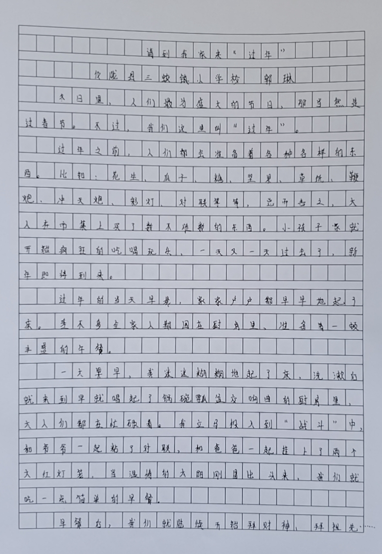 一大早,我迷迷糊糊地起了床,洗漱后就来到早就唱起了锅碗瓢盆交响曲的厨房里,大人们都在忙碌着。我立马投入到"战斗"中,和爷爷一起粘了对联,和爸爸一起挂上了两个大红灯笼,当温情的太阳刚冒出头来,我们就开始吃一点简单的早餐。