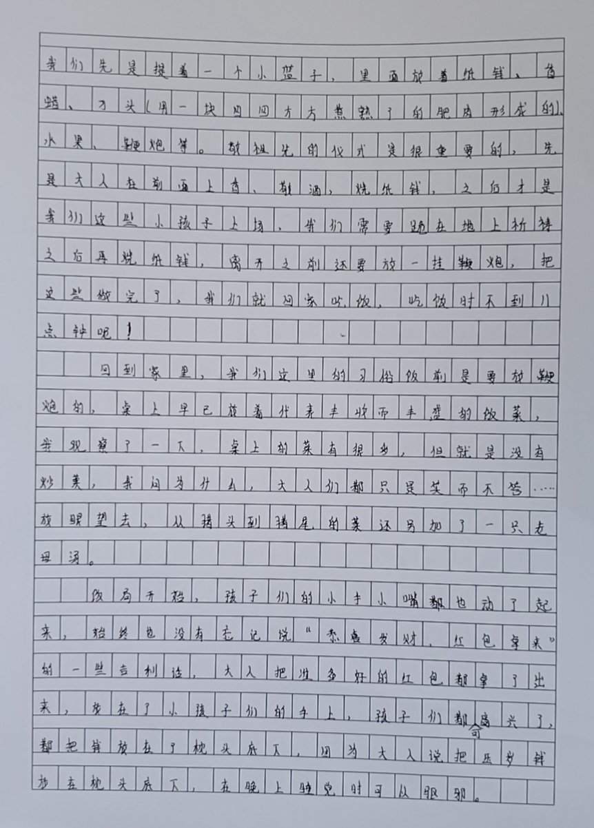 早餐后,我们就陆续开始拜财神、拜祖先……我们先是提着一个小篮子,里面放着纸钱、香蜡、刀头(用一块四四方方煮熟了的肥肉形成的)、水果、鞭炮等。敬祖先的仪式是很重要的,先是大人在前面上香、敬酒,烧纸钱,之后才是我们这些小孩子上场,我们需要跪在地上祈祷之后再烧纸钱,离开之前还要放一挂鞭炮,把这些做完了,我们就回家吃饭,吃饭时不到11点钟呢!