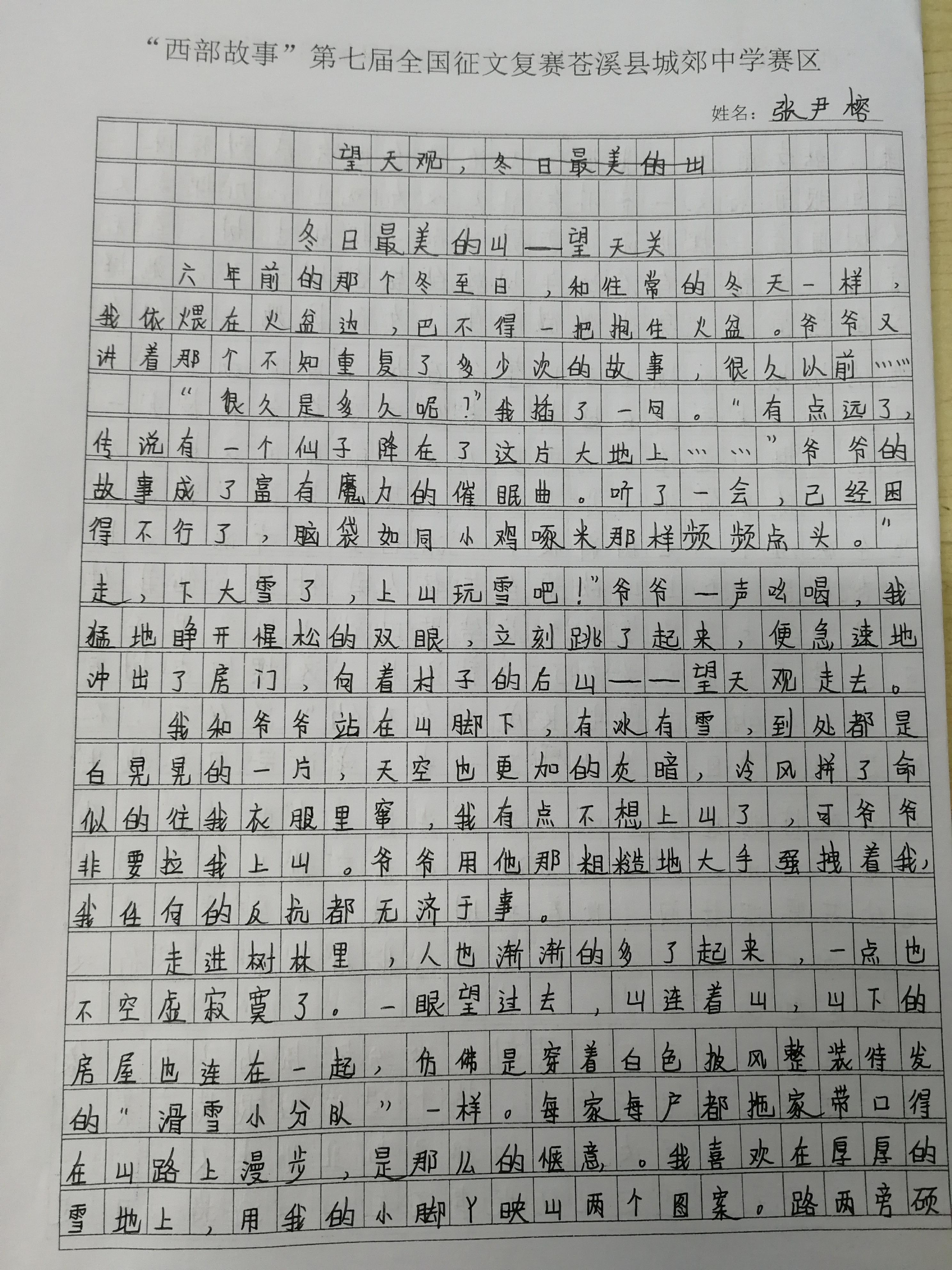 “很久是多久呢?”我插了一句。“有点远了,传说有一个仙子降在了这片大地上……”爷爷的故事成了富有魔力的催眠曲。听了一会,已经困得不行了,脑袋如同小鸡啄米那样频频点头。“走,下大雪了,上山玩雪吧!”爷爷一声吆喝,我猛地睁开惺松的双眼,立刻跳了起来,便急速地冲出了房门,向着村子的后山——望天观走去。