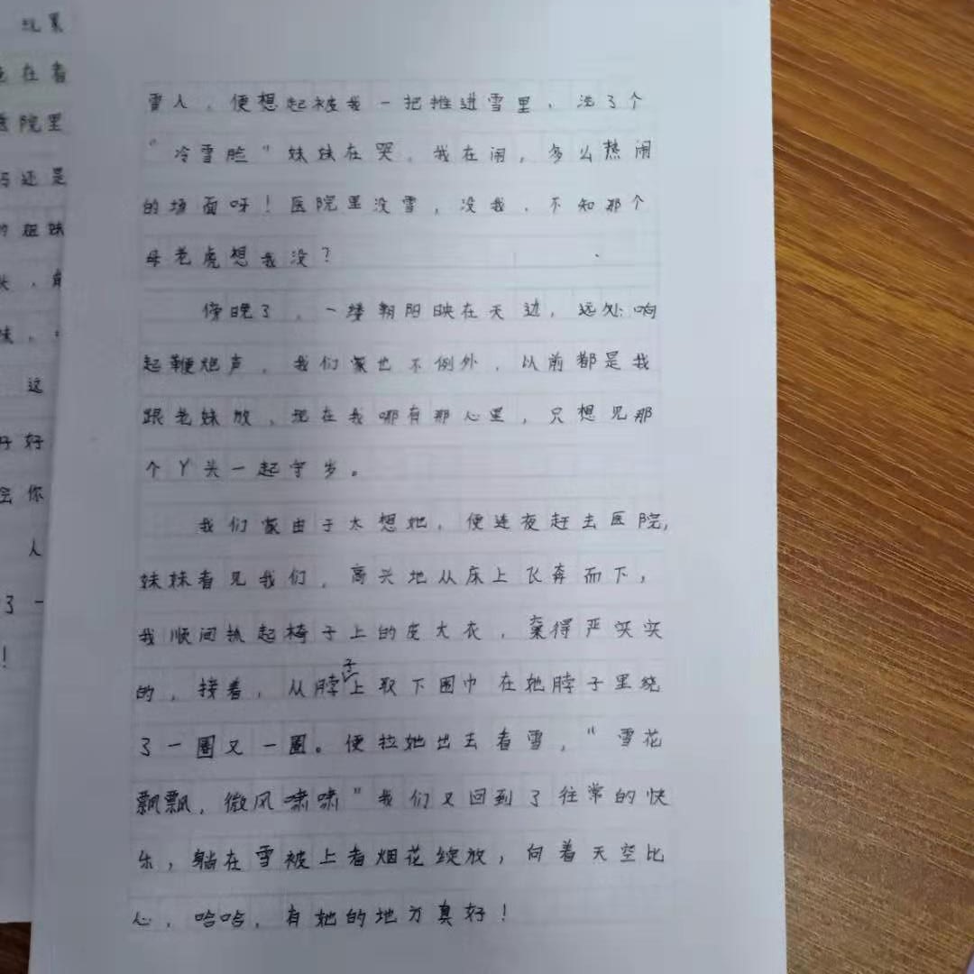 我们家里人由于太想她,便连夜赶去医院,妹妹看见我们,高兴的从床上飞奔而下,我瞬间抓起椅子上的皮大衣,把她裹得严严实实的,接着从脖子上取下围巾在她的脖子里绕了一圈又一圈,便拉他出去看雪,“雪花飘飘,微风啸啸!”我们又回到了往常的快乐,躺在雪地上看烟花绽放,向着天空比心。哈哈,有她的地方真好!
