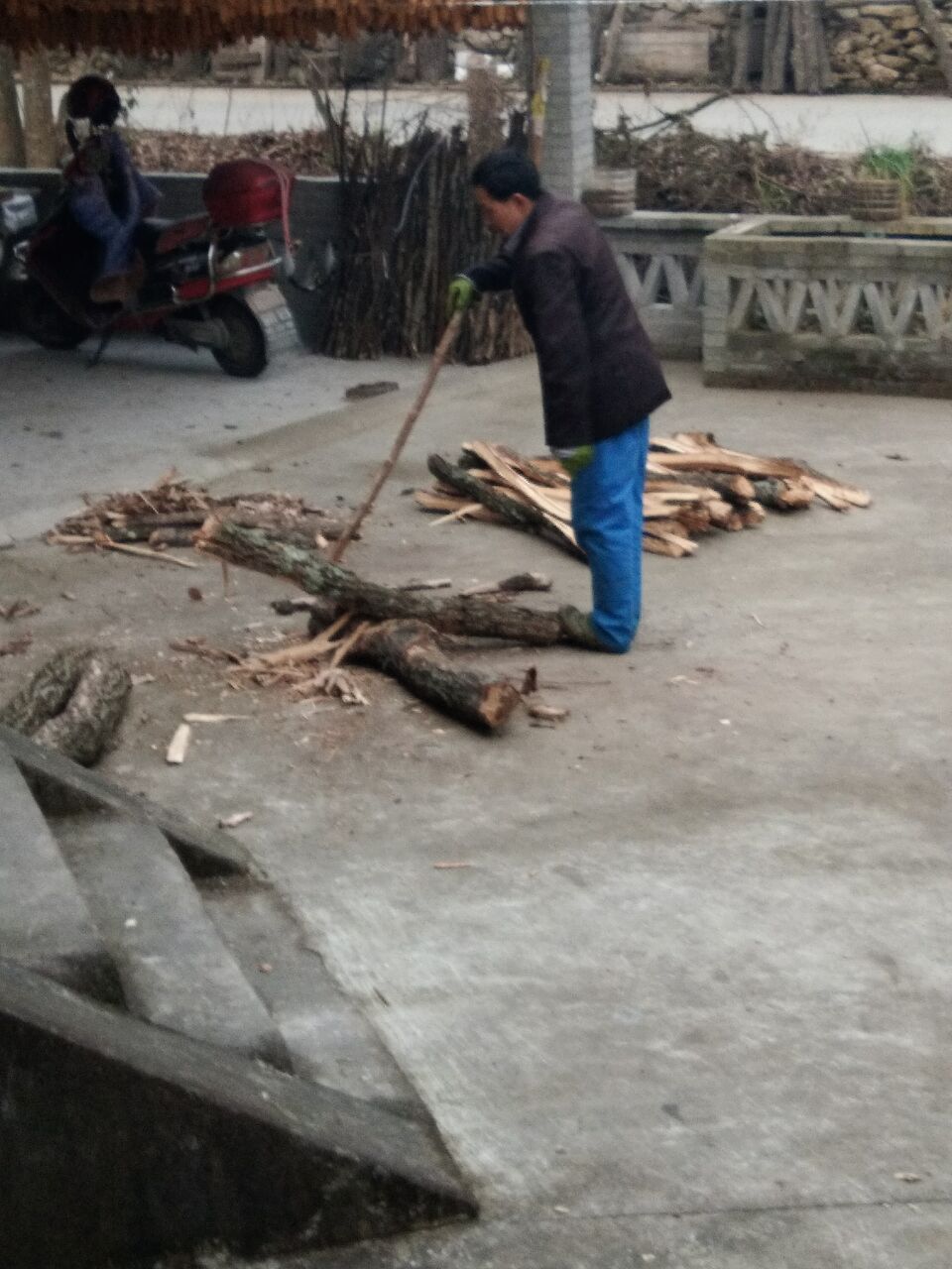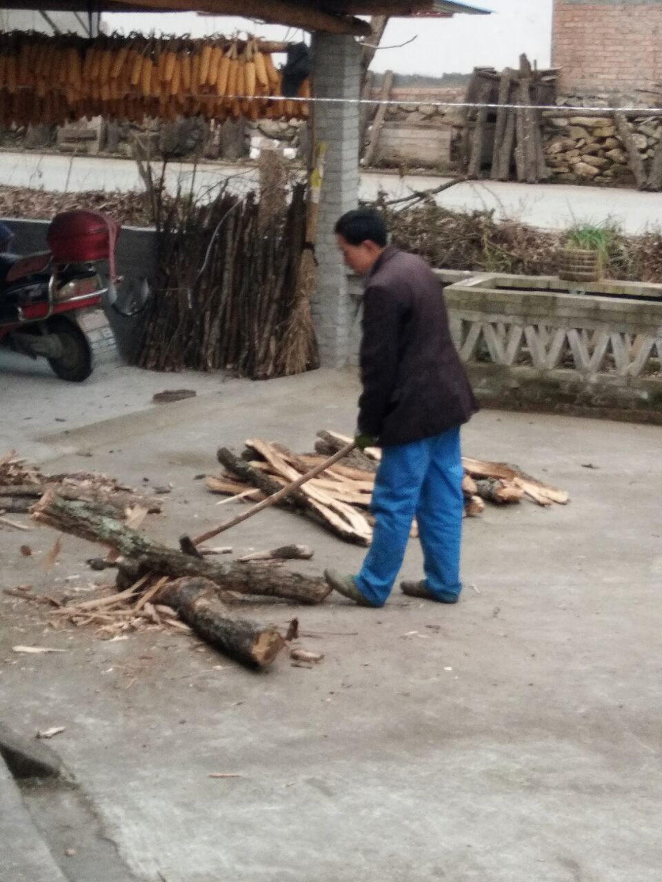经过一番周折,舅舅载着他的成果来到了张大爷家,没顾上歇气,又要将圆木头劈成条状,他一只脚踩住木头,一只脚踩在地上,好似一位运动员的起跑姿势,这木头在他的脚下似乎很听话,裂的缝子几乎是条完美的直线,我不禁赞叹舅舅的鬼斧神工。这斧头使了好些年了,也钝了,舅舅就在磨刀石上"嚓嚓嚓"的打磨,时不时在上头淋点水,当它崭新的一面展现在我眼前,我说了句:"又是把新斧头!"他将它擦得锃亮,然后放在了他的工具箱里,又回过去把柴火放整齐,搬到了张大爷院子的棚下。