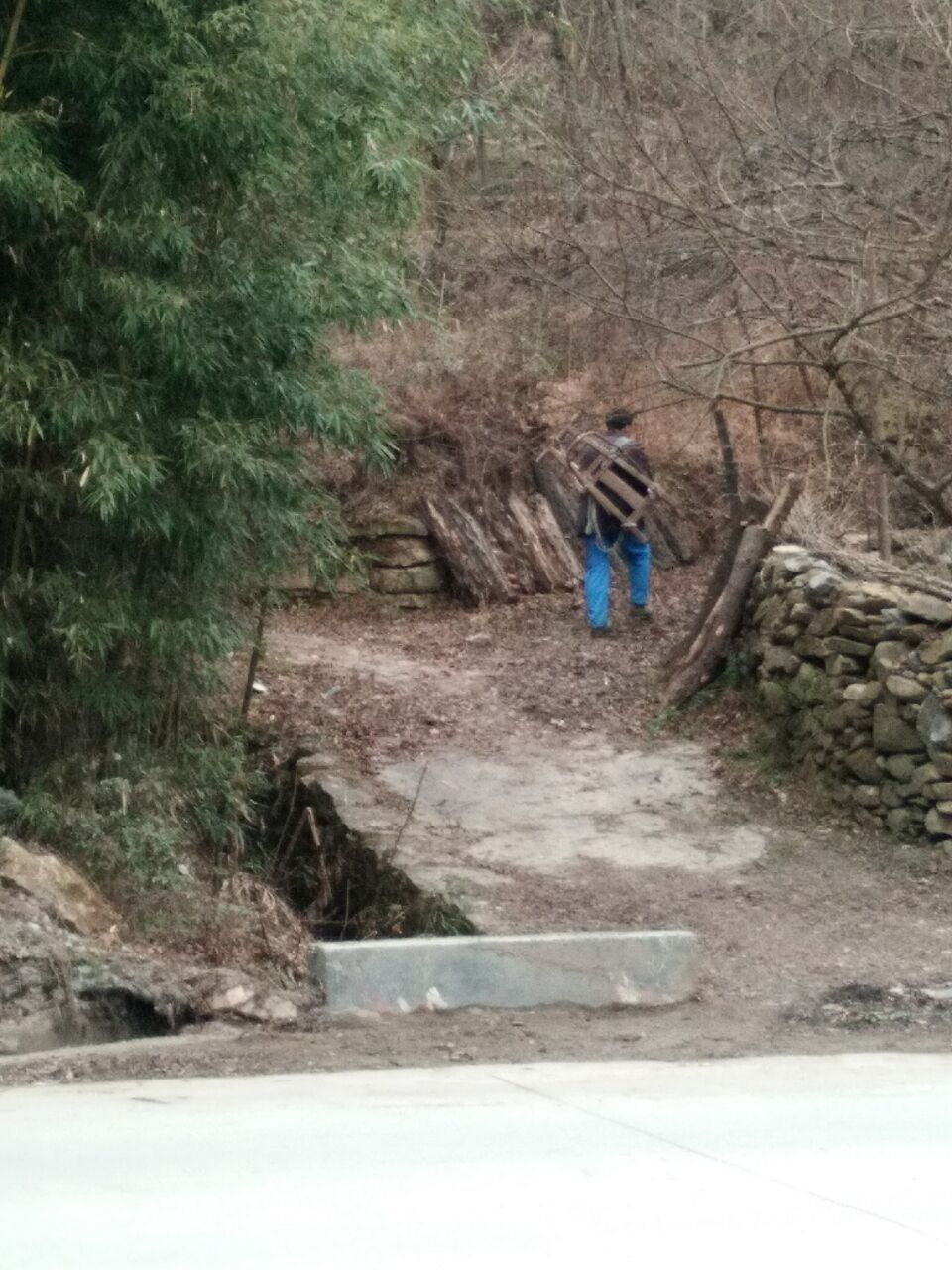 稍微歇了会儿,舅舅又抡起了他的斧头,将木头砍成均等的几份,固定在背架子上,蹲下身子背好后猛地站起来,随手拿了周围的一根棍子,就往五保户张大爷家走了。在崎岖的山路上,他每一步都走得十分小心,嘴里却又在哼着家乡小调:"花哟,咿呀咦兹为……"