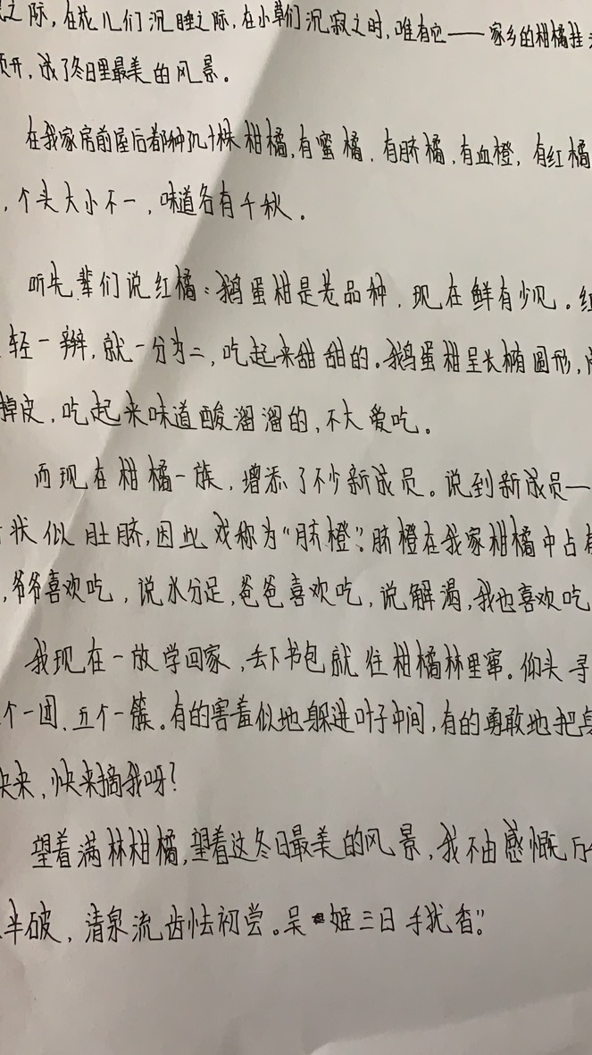 我现在一放学回家,丢下书包就往柑橘林里窜。昂头寻找那又大又黄的脐橙,只见树上三个一团,五个一簇。有的害羞似的躲进叶子中间,有的勇敢的把身体展露出来,仿佛在说:“小主人快来,快来摘我呀。”