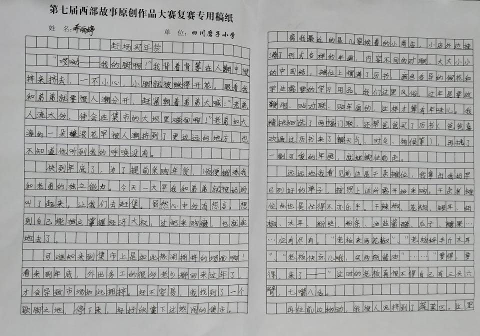 最后我来到了水果区。这里可是我和弟弟常来光顾的地方。远远的,老板娘就在跟我打招呼了:“小姑娘,今天要买什么水果?”“老板,你先让我喘口气。”于是,老板娘帮我把背篓放下来。我舒了一口气,开始挑选水果。苹果香蕉梨,葡萄柚子枣,橘子芒果橙,桂圆山竹桃……哎,琳琅满目的果品看得我眼花缭乱。“姐——”只听远方传来清脆的一声喊。我正愁背不动犹豫要不要买的时候,我的弟弟终于找到我了。于是我和弟弟采购了自己喜欢的水果就准备高高兴兴地回家了。
