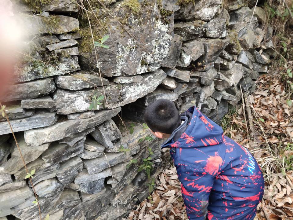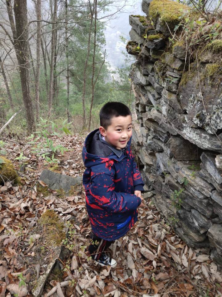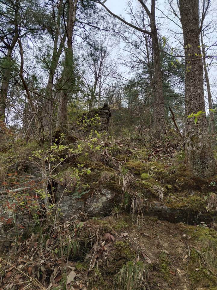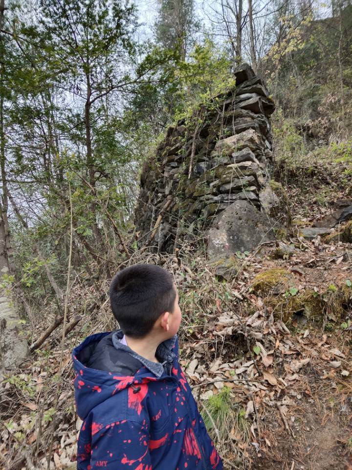 休息了一会,便继续赶路了,然而啊,这地方好久没人来,一些地方连路都塌了,只能抓住树枝活着草,爬着向上走,弟弟好几次摔了几个狗吃屎,我为弟弟保驾护航,手上也扎了好多刺,不过呢,危险的地方走过了也就好了,峰回路转啊,到了一个小的平台,四周被高大的树包围着,阳光照射不进来脚下都是青苔,正前方有着一个石阶,这可不是人为的,而是大自然的鬼斧神工啊!弟弟那个小短腿,想上石阶只能爬上去,给人一种超级滑稽的感觉。 终于,我们到了,映入眼帘的是一个半圆形的建筑物,上面已经坍塌了,中间也塌掉了,就像给一刀劈开一般,这个堡垒有两层,最外边的是用大块石头垒起来了,里面用的是小的长方形石块,垒的比较整齐,依稀可以找到一些方孔,那应该就是放枪的地方了,我弟弟还给我说他想找子弹,我脸都黑了,不知道怎么回答,我仔细看了下,这个堡垒占地面积还是很大的,不过有些地方坍塌了,看起来,就比较小了,我拍摄的照片角度不好,所以看起来就像是一面强求,但是那是半圆形的,环顾了四周,感叹啊,时间的力量,纵然是这坚固的堡垒,也只能落个如此下场……