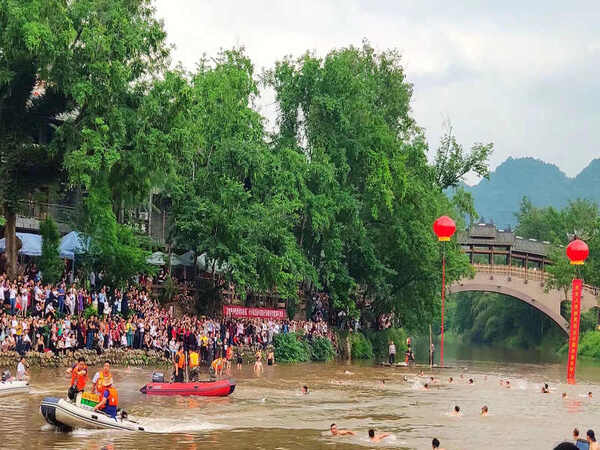 抓河鸭是民俗文化节最精彩的一个环节,镇子里的每一个人都可以报名参加。男人们光着膀子跃入水中去抢河里欢脱扑腾的鸭子,谁抓住了就是谁的,河里的运动员们你争我抢不甘空手而归,岸上的观众们欢呼呐喊,场面可不比世界运动会容易,每一个人的脸上都洋溢着快乐的笑容。