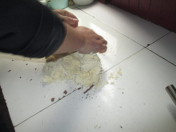 趁这段时间继续做节节子,做节节子的配料有,面粉,玉米面。首先我们取适量的面粉和玉米面放在一起,用手把它搅拌均匀。然后用温水把面拌湿,记住水不能倒多了,双手使劲揉面,为了面吃起来更有口感,大约要用十分钟左右就可以用擀面杖擀成一个大的圆形。