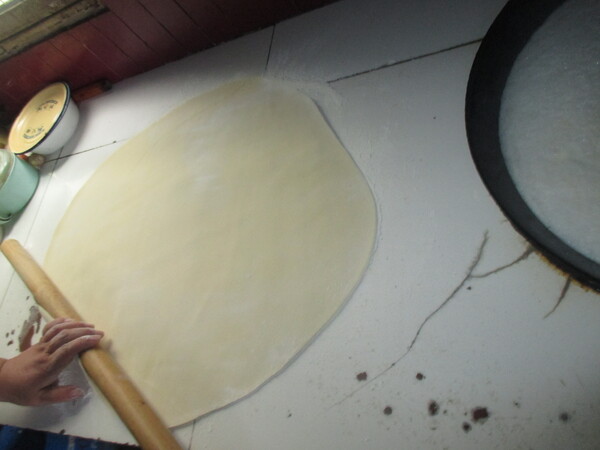 擀面也有一定的技巧,两只手用的力要均匀要不然就薄厚不一样。面擀好后,要淡淡的在上面撒一层玉米面防止它在折叠以后黏在一起。把面折好后左手轻轻的压住面,右手拿刀切,之所以妈妈切面的技术这么好是因为妈妈以前像我们这个年龄的时候,每天都是她在做饭。有时妈妈切面切得不均匀时,我听妈妈说,她的奶奶都会骂她,妈妈做着做着就熟练了。