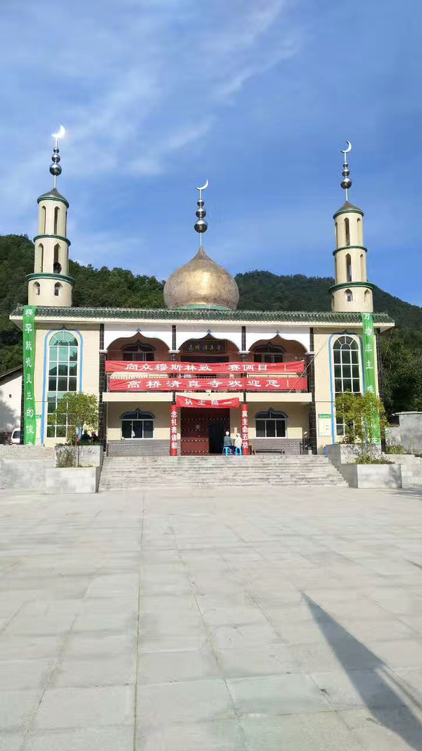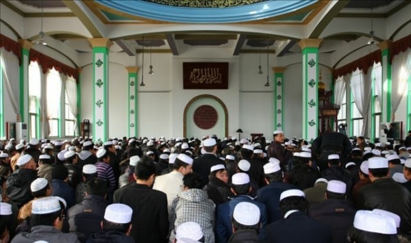 通体洁白的大殿里铺设着绿色的地毯,给人一种清纯肃穆的感觉。身着白色长衫,头缠米黄色围巾的教长,排在最前边。数百人整齐划一的列成横队,面向西方圣地麦加的方向进行礼拜,祈祷。然后,教长手持圣仗登上宣讲台,再次诵读"古兰经"篇章。人们表情凝重,满脸虔诚。穆斯林们也都互道着穆斯林的祝安词:"安塞俩目,迩来库目"。那意思是,"愿真主赐福给你"。热情的问候和真挚的祝福洋溢在寺里寺外。