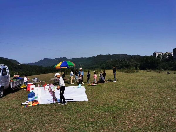 图2:在一个阳光明媚的早晨,大家来到宽阔而又平坦的大坝草地上准备烧烤。大家以风一般的速度铺好垫子、搭好桌子、撑起太阳伞……准备好所有食物调料。叔叔在一旁挖坑置锅烧饭,旁边的小孩站在那里观看学习,生活是一个别样的学校。有的人就静观其变,看着这幅"美景"。大家手忙脚乱地"忙"起来了。
