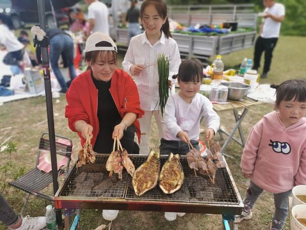 图3:我们一家三口脸上洋溢着欢快的笑容,手里拿着串好的食物。妹妹在一旁跟着妈妈的指导做的有模有样。我在一旁看着妈妈烤出色香味俱全的食物,我口水都快流了下来。旁边的人则在一旁吃着刚出炉的烤串,欣赏着美丽的风景,悠闲极了。真是美味"烧"不尽,佳肴"烤"不完。