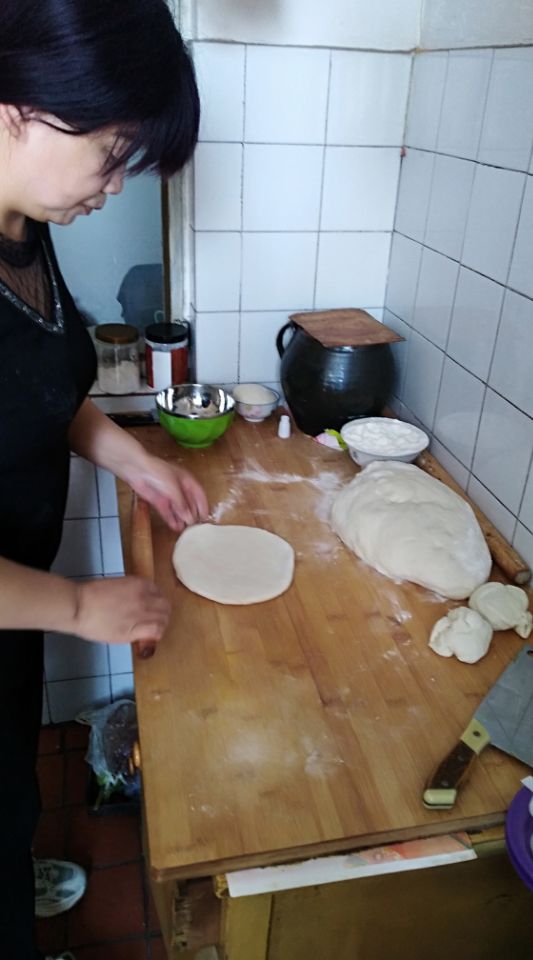 家乡用的是酵头面,所以妈妈先放入适量的碱面并揉匀,再分成小剂子,一个个擀成薄薄的圆形,越薄越好。