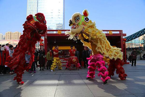 最精彩的莫属采青了。两只狮子先各自虎视眈眈的绕了两圈,突然,一只狮子捷足先登,踏上桌子,欲想一口拿下,另一只狮子也不甘落后,原地起跳,直接抢在他前面,他们同时跃起,挂青人却故意把青升高,这到好,两只狮子撞了个满怀,到了地下似乎还有点晕头转向的意思,其中一只狮子趁其不备,三步并作两步,三两下跳上了桌上,后脚使劲一蹬,整个身子竖起,提前张开的大嘴一口将青吞下,生怕别人抢走了。