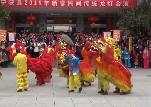 瞧,只见一个大头和尚并两只狮子,活蹦乱跳的来了。大头和尚宽肩粗腰,合中身材,顾盼神飞,观之可亲,戴上一个一点儿也不合适的头饰,配上“瞻前顾后”的步伐,颇为滑稽。狮子们身披红袍,头顶彩灯,胖墩身材,温驯可爱,两只溜圆的眼睛下,张着血盆大口,真惹人喜爱。它前脚抬起,后脚并拢,一跃而起,做出打招呼的姿势,随着震天动地的锣鼓声开来,小狮子时而趴下,时而站起,眼睛犹如进了沙子,眨个不停。
