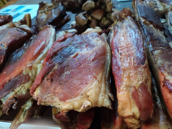 接下来便是主角登场,奶奶拿出新鲜的肉在盆中裹了几下,为他们穿上一层保护壳,防止微生物进入,使它们变质。我站在一旁盯着盆里的肉,奶奶不仅将它们在盆里来回翻滚,还用手给它们按摩,让它。让它们吸收的更充分,同时嘴里念念有词的说:“娃儿啊,奶奶将腊肉腌好,等你爸妈回来,让他们带过去吃,这样呀,他们在外面也能吃到家的味道了。”然后奶奶将裹好的腊肉用绳子串起来,挂在火坑上方,用烟熏它们,那一年,我六岁。