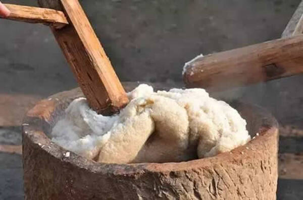 糍粑是分几种制作方法,而最常见的便是用木锤敲击的方法,因为这样打出来的糍粑才更劲道,小时候只见奶奶把洗净的糯米用一口大锅蒸熟,然后便是无休止的反复敲打成最后又粘又粘的样子,那样的糍粑可以粘掉一整口牙。